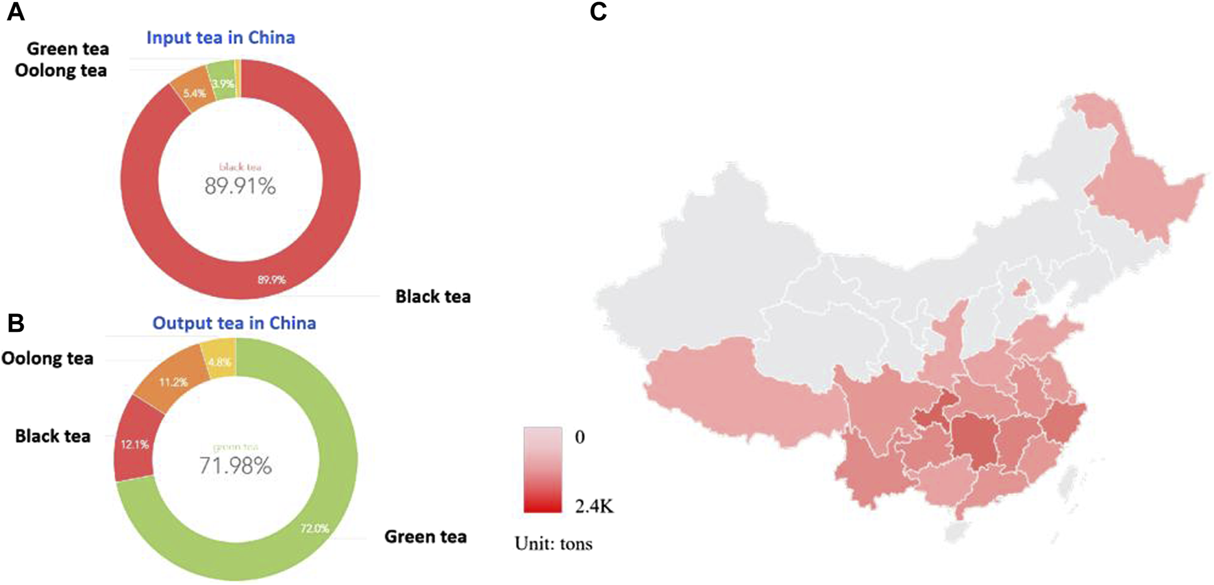 China as a major exporter and importer of tea (A). Fermented tea accounts for the majority of China’s imported tea, with black tea accounting for 89.91% of the trade volume; (B). Non-fermented tea accounts for the majority of China’s tea exports, with green tea accounting for 71.98% of the trade volume, black tea accounting for 11.79%, and oolong tea accounting for 11.19%. (C). Schematic diagram of the main production areas and export volume of fermented tea in China, mainly concentrated in the Yangtze River Basin in the south.