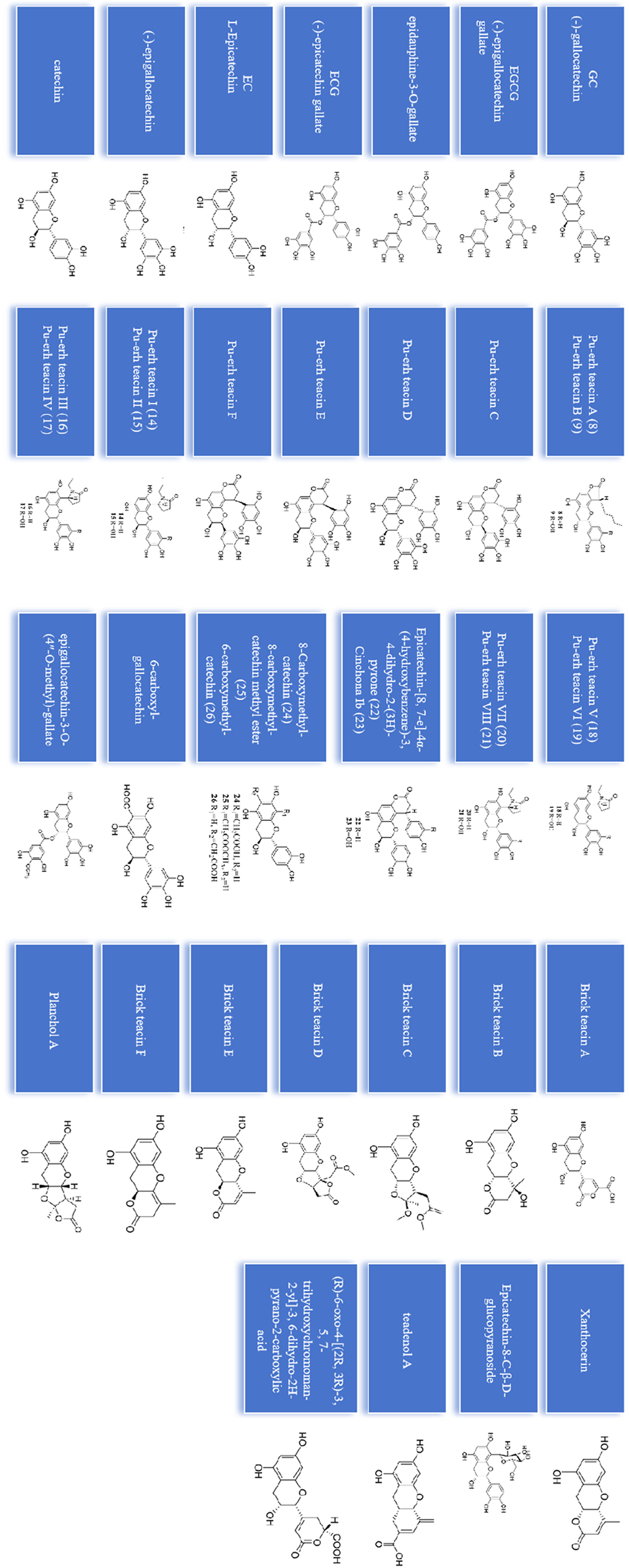 Catechins are the most important component of tea polyphenols, and different types of fermented tea often contain catechin derivatives with different oxidation configurations. Currently, 39 catechin compounds have been identified from oolong tea and black tea (Hu, 2022) (Figure 2). And a large number of studies have shown that (−)-epigallocatechin-3-gallate (EGCG).
