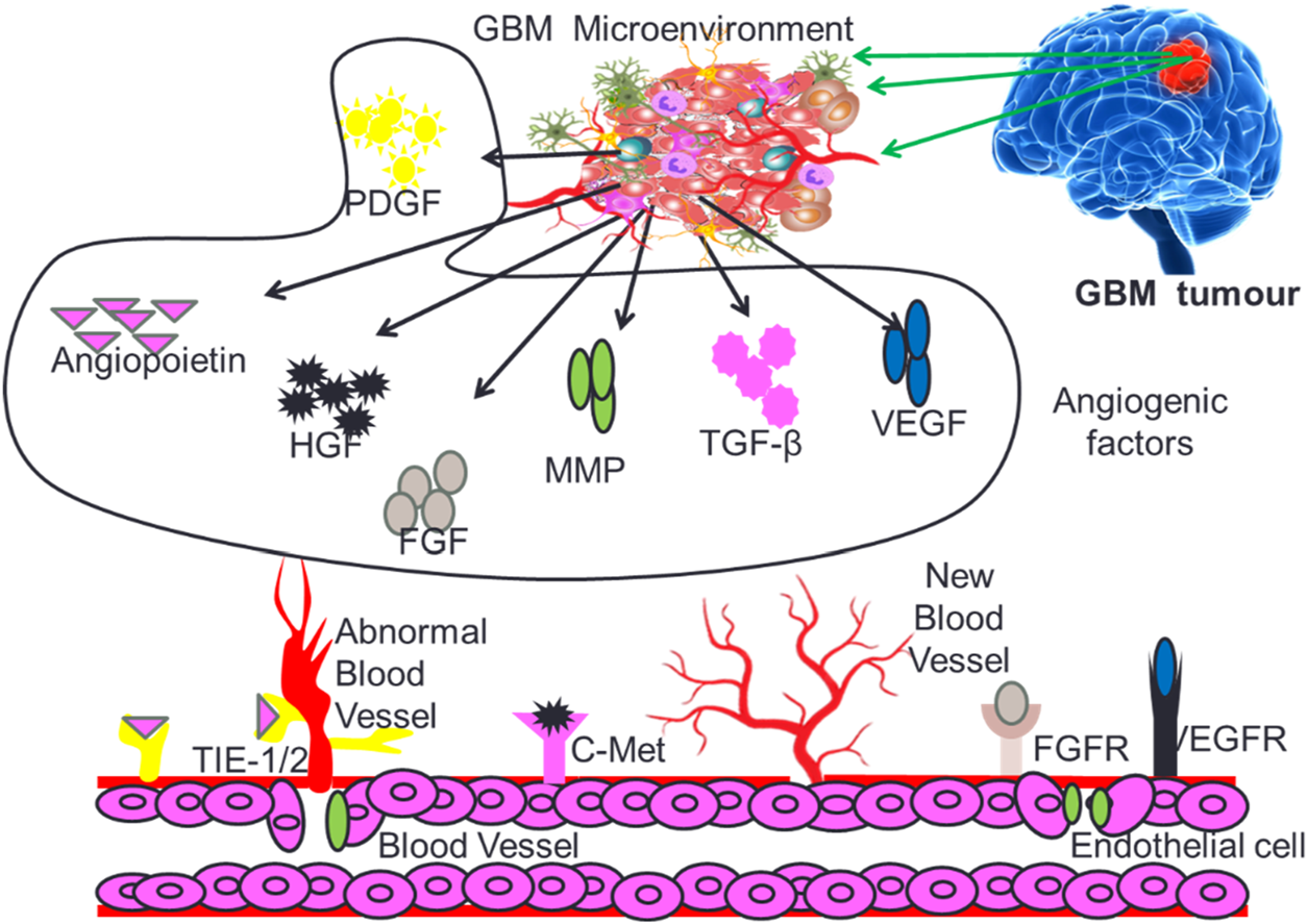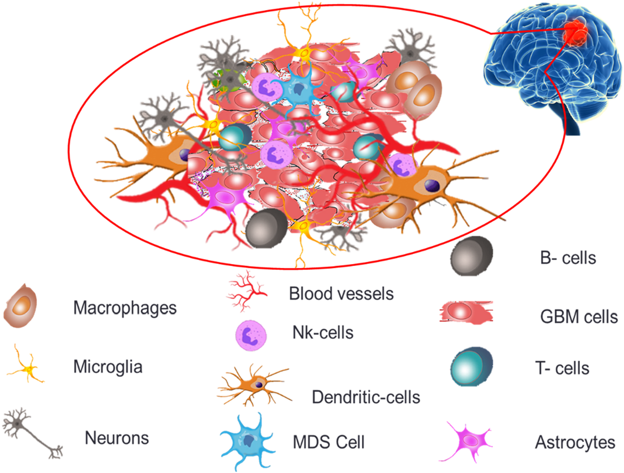 The microenvironment of GB is highly complex and dynamic with various cross-interacting components that contribute towards the tumor formation and invasion. Some of the components of the tumor microenvironment and their roles are described as under.