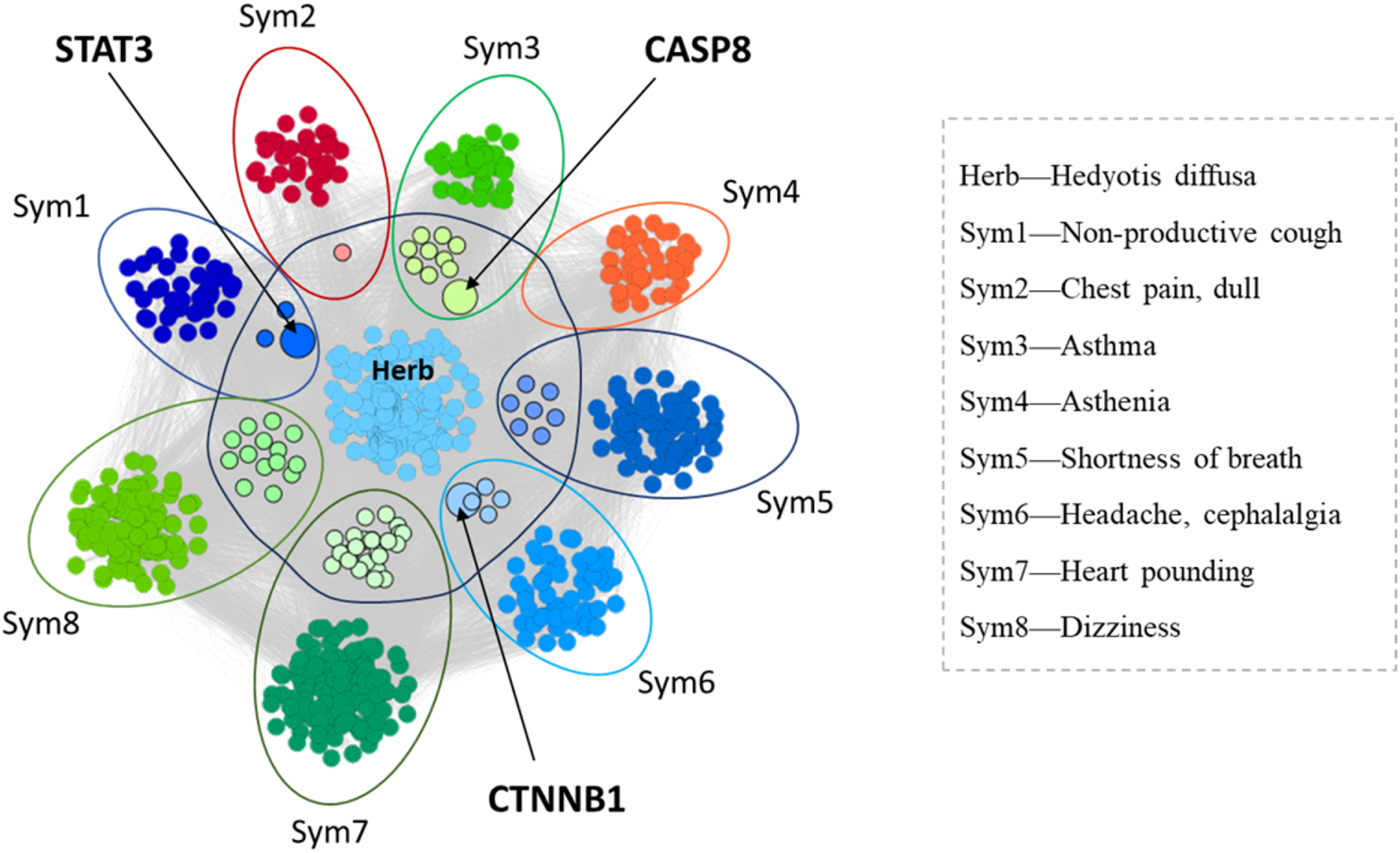 In order to further study the mechanism behind the treatment of diseases by traditional Chinese medicine, a molecular network-based correlation analysis was further conducted on the collection of genes associated with traditional Chinese medicine and the collection of genes associated with diseases and symptoms. Network medicine leverages the human protein-protein interactome (PPI) to reveal disease and drug patterns. The PPI is a network consisting of nodes that are proteins that link to each other by physical (binding) interactions. Network medicine showed that disease-associated proteins tend to form locally clustered modules in the PPI, and shorter network distance between two disease modules is indicative of their comorbidity.