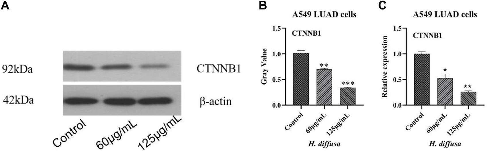 H. diffusa inhibits the proliferation and promotes apoptosis of LUAD A549 cells, which may be related to the fact that H. diffusa can regulate the expression of CTNNB1.