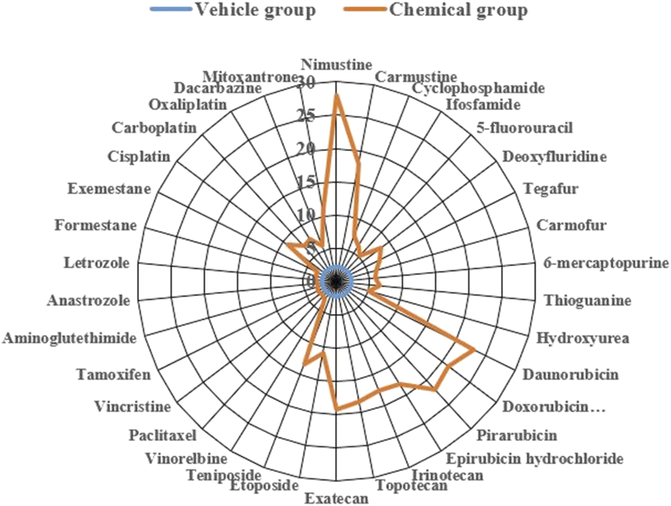 Thirty-four chemotherapy agents were obtained from Yuanye Bio-Technology Co., Ltd. (Shanghai, China) and their purity exceeded 98%. The identities of the 34 chemotherapy agents are shown in Table 1. All the agents were chosen from major categories (classes) based on their chemical structures and the way they act on cancer cells, representing a broad range of chemotherapy activities. Based on the concentration used in the in vitro genotoxicity tests reported in the literature, the maximum concentration of agents used in this study is 1 mM (Kirkland et al., 2016).