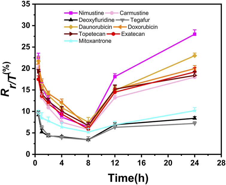 Cytotoxicity of 34 chemotherapy agents in HepG2 cells, including alkylating agents (A), antimetabolites (B), antitumor antibiotics (C), antitumor plant products (D), antitumor hormones (E) and various miscellaneous agents (F). The value of RCC indicates the cytotoxicity. Each value was expressed in the form of mean ± SD (n ≥ 3).