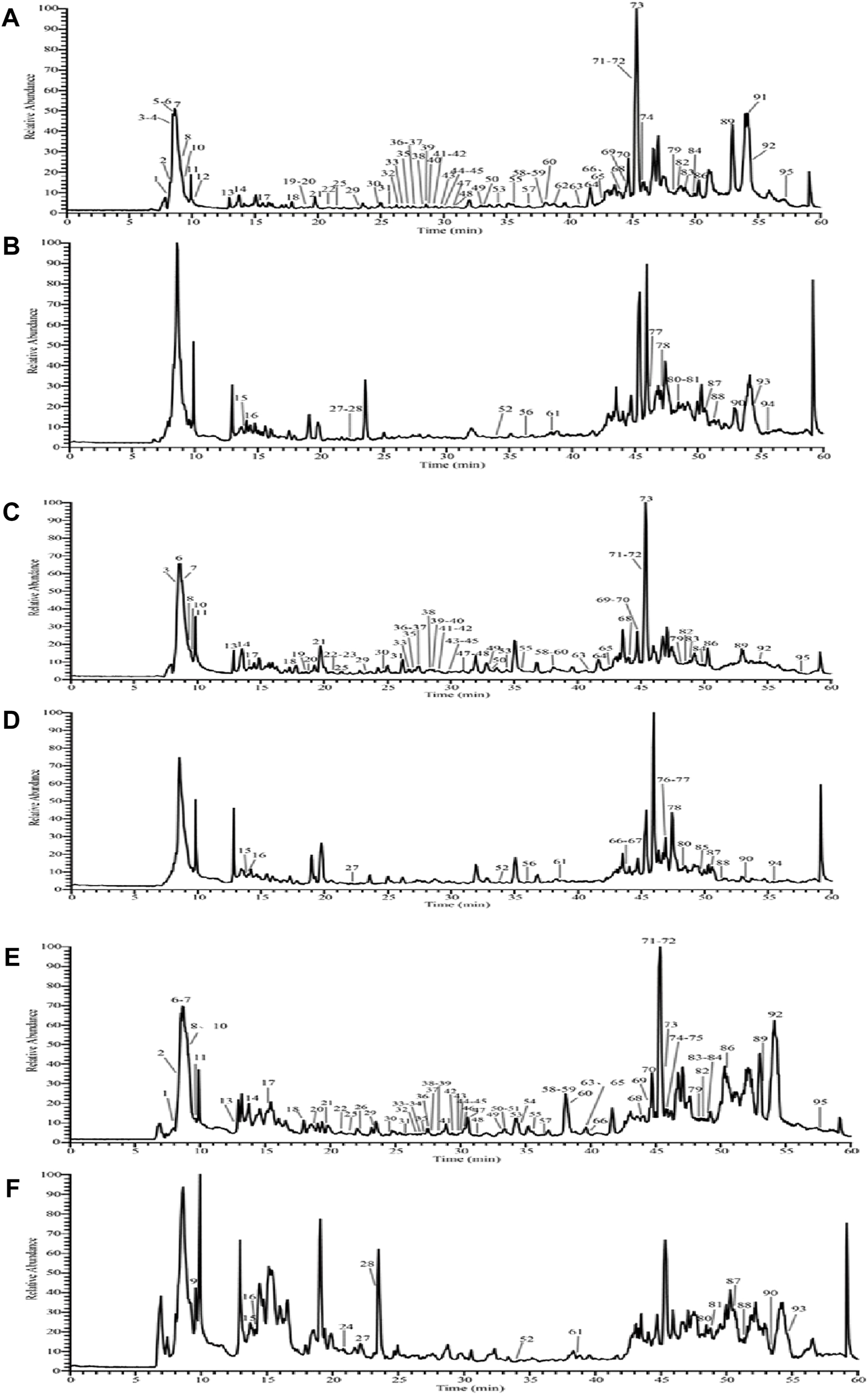 FIGURE 1. Total ion flow diagram of MMF with three different fermentation methods. Negative ion mode total ion flow diagram of the naturally fermented MMF without R. oryzae (A); positive ion mode total ion flow diagram of the naturally fermented MMF without R. oryzae (B); negative ion mode total ion flow diagram of the naturally fermented MMF with R. oryzae (C); positive ion mode total ion flow diagram of the naturally fermented MMF with R. oryzae (D); negative ion mode total ion flow diagram of the commercial MMF (E); positive ion mode total ion flow diagram of the commercial MMF (F) (each serial number represents the presence of a chemical component).