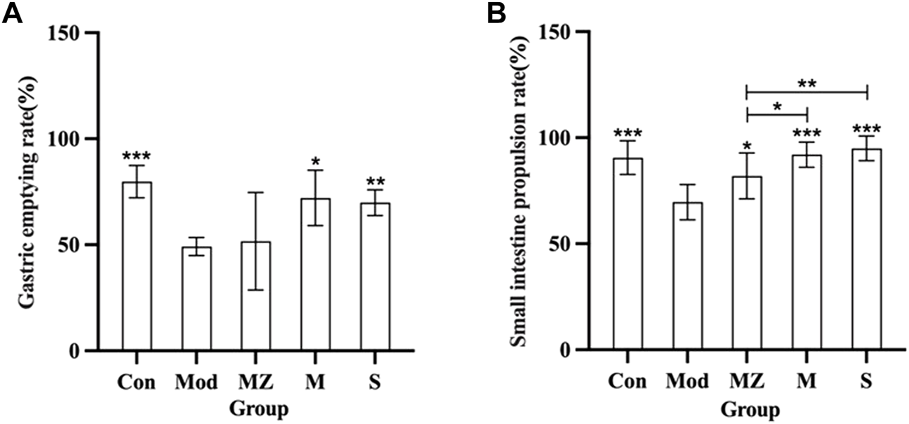The gastrointestinal motility of model mice was characterized by the gastric emptying rate and small intestine propulsion rate.