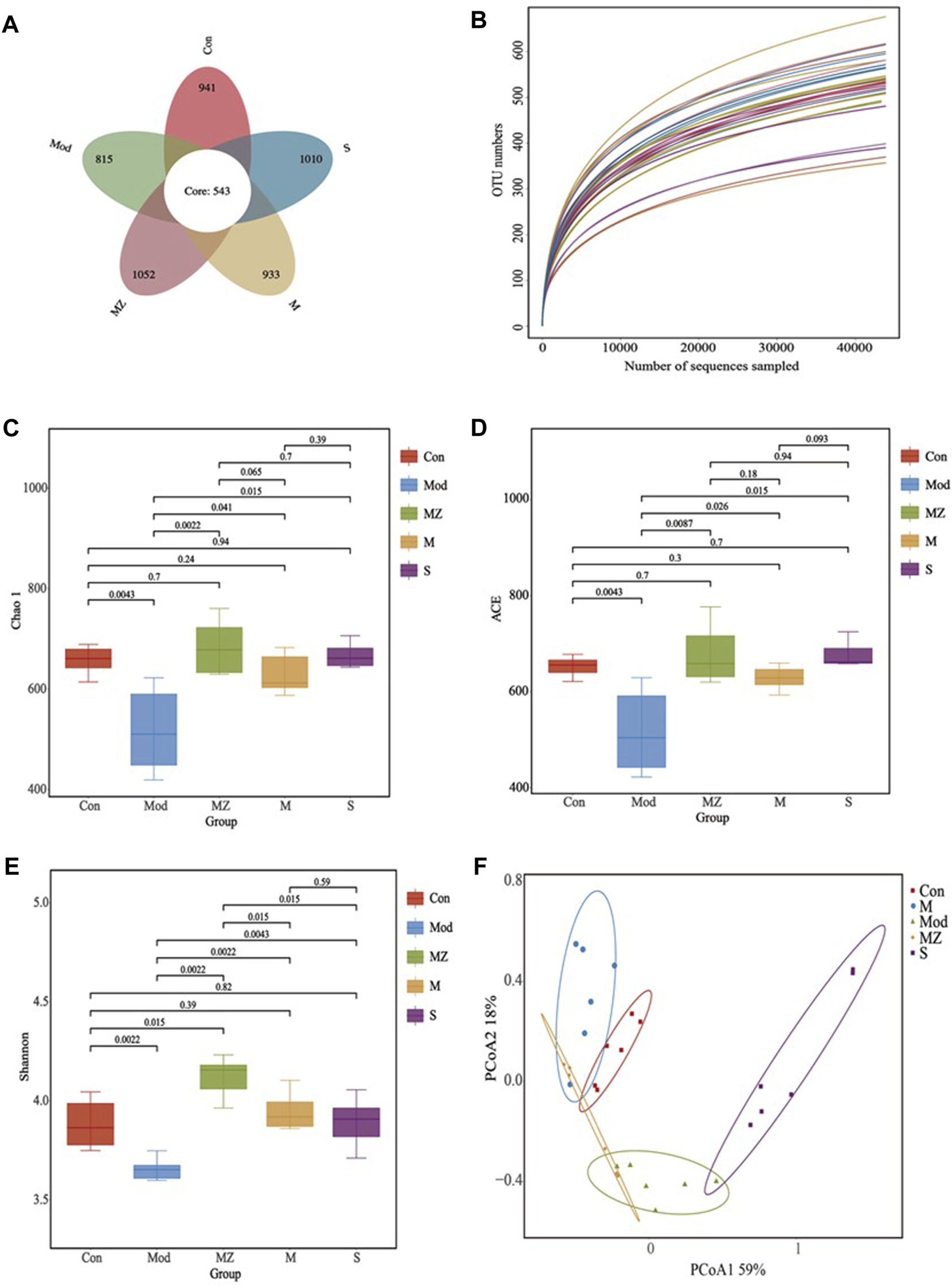 Analysis results of intestinal microbial species diversity in different treatment groups (n = 6). Petal diagram showing the number of OTUs in different treatment groups (A); the dilution curve reflects the sample size of different treatment groups (B); Chao 1 index reflecting species richness in different treatment groups (C); ACE index reflecting species diversity and stability in different treatment groups (D); Shannon index reflecting species diversity in different treatment groups (E); and PCoA analysis reflecting species abundance and similarity in different treatment groups (F).