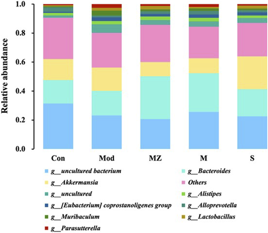 In order to visually display the gut microbiota structure of different experimental groups, the top 10 species with abundance in phylum and genus levels were selected to make stacked bar charts, and the changes in gut microbial structure and abundance were observed among the groups.