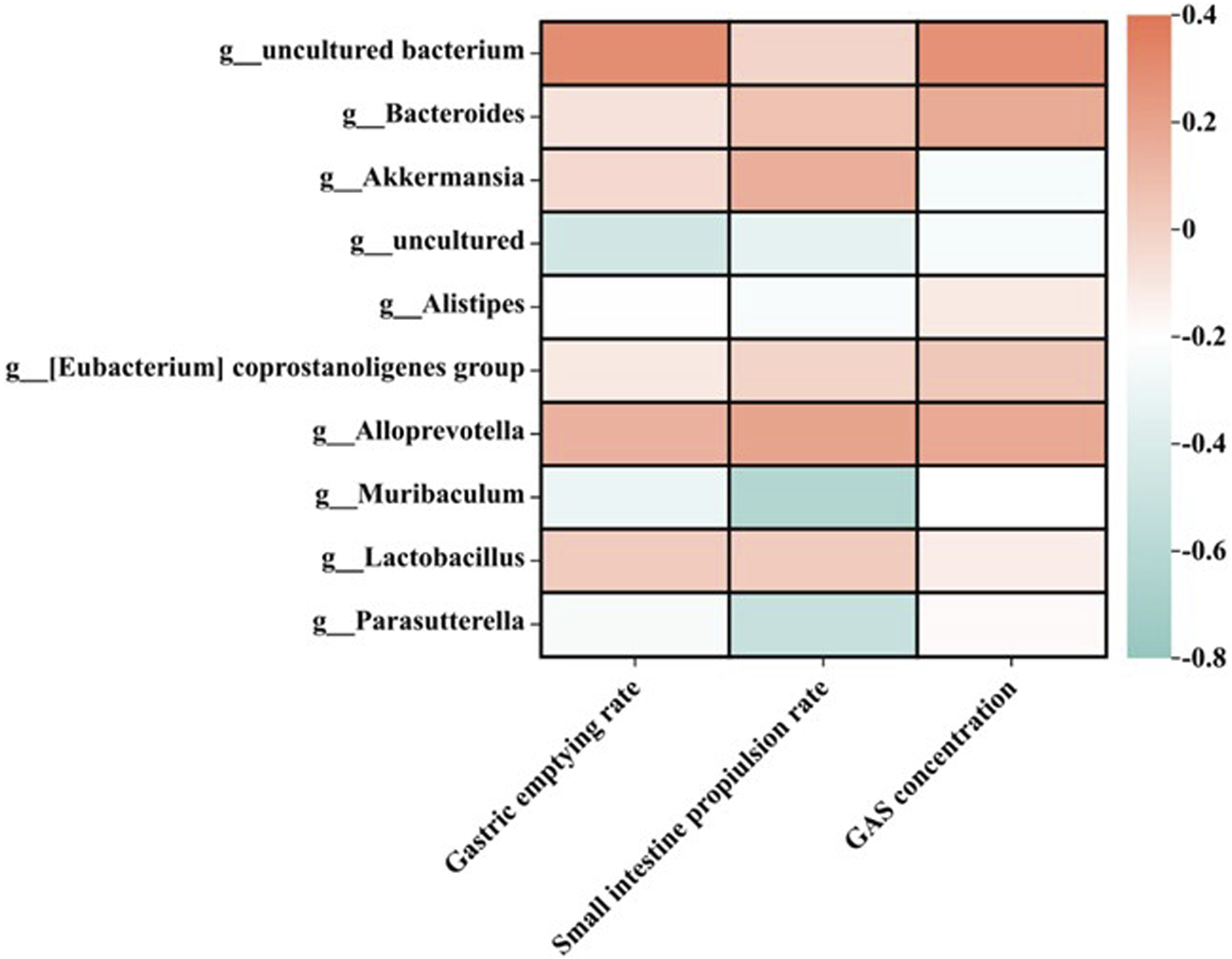 FIGURE 7. Relationship between gastric emptying rate, intestinal propulsion rate, and GAS concentration in different treatment groups at the genus level (n = 6).