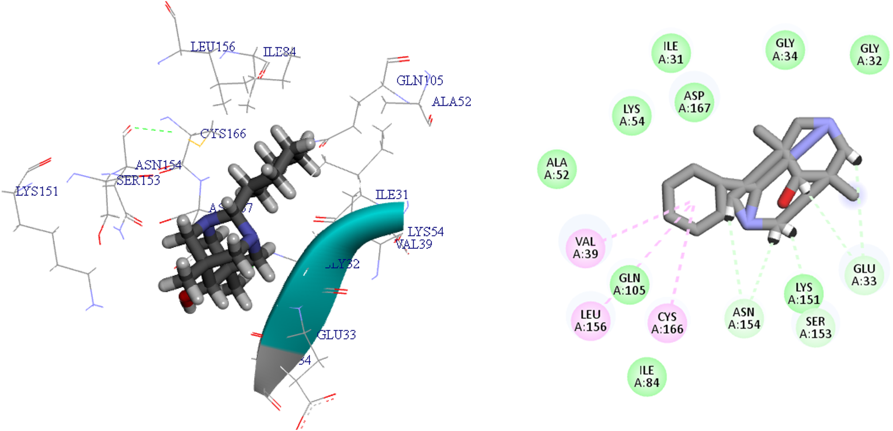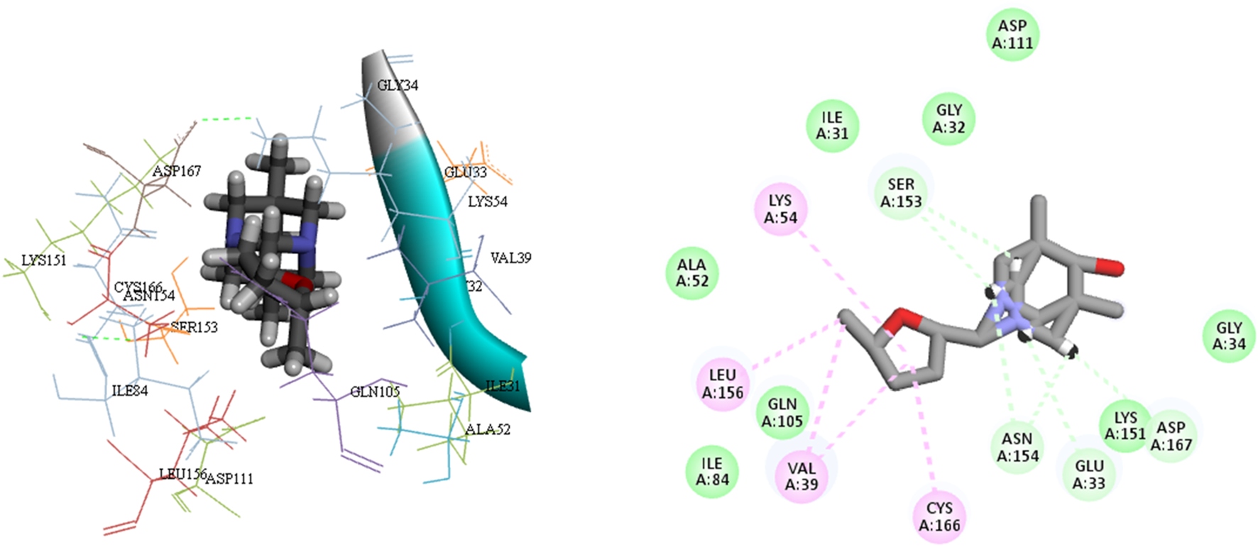 | L 6 | −5.59 | Lys54 | Ser153, Asn154, Gln105, Glu33 | Asp111, Lys151, Ile31, Leu156, Ala52, Glu71, Ile84, Asp167, Gly32, Gly34, Tyr113 | Cys166, Val39 | |