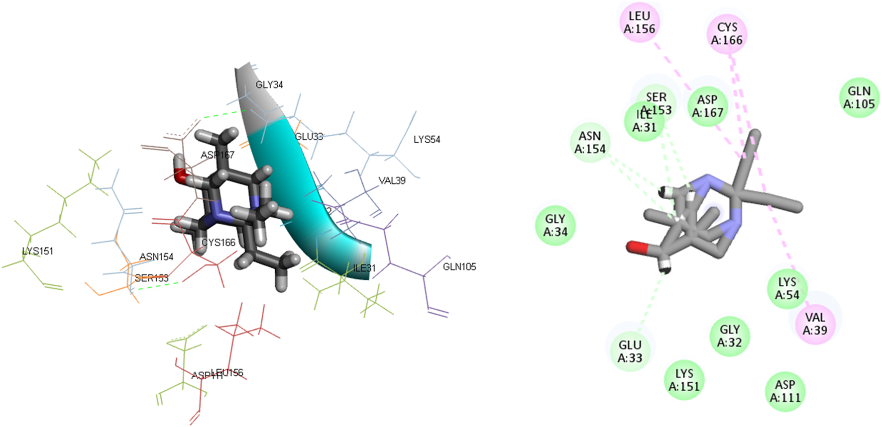 | L 9 | −5.39 | Ser153, Asn154 | Leu156, Lys54, Asp167, Asp149, Ala35, Gly34, Glu33, Gly32, Asp111 | Val39, Cys166, Ile31 | Lys151 | |