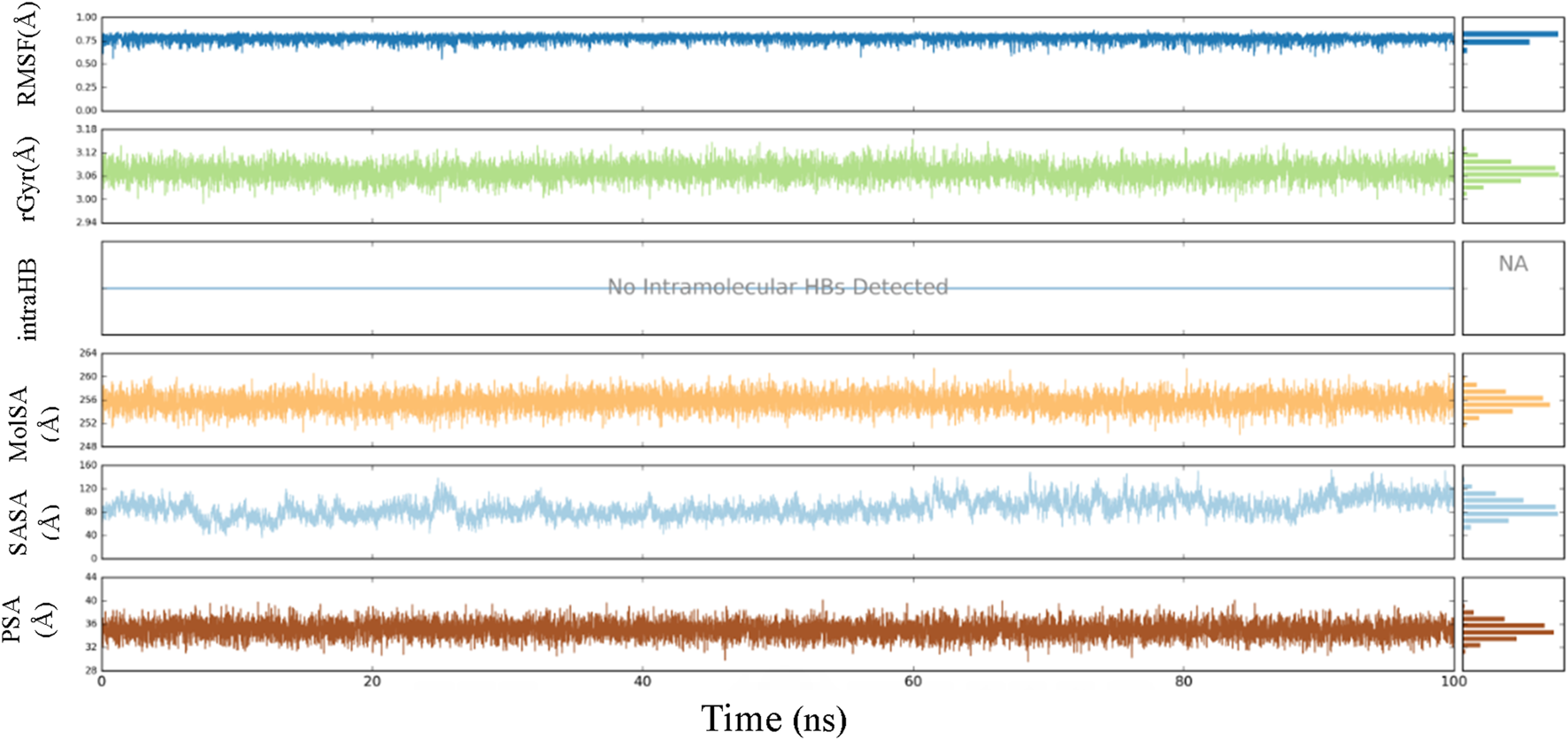 MD simulation was conducted utilizing Desmond through the Schrödinger-Maestro interface (Desmond, 2017). This enables the precise identification and prediction of ligand-receptor interactions and the validation of molecular docking results. MD simulations were performed by solving a substance in an explicit orthorhombic water box using the SPC water model. Sufficient Cl ions were added to the system in order to counterbalance the overall charge of the complex. The duration of the simulation was 100 ns. The NPT ensemble was utilized, maintaining a constant number of atoms, a pressure of 1.01325 bar, and a temperature of 300 K. The default thermostat was the 1.0‐ps interval Nose-Hoover chain method, and the default barostat was the 2.0‐ps interval Martyna-Tobias-Klein. The maestro simulation interaction diagram was used to assess the MD simulation.