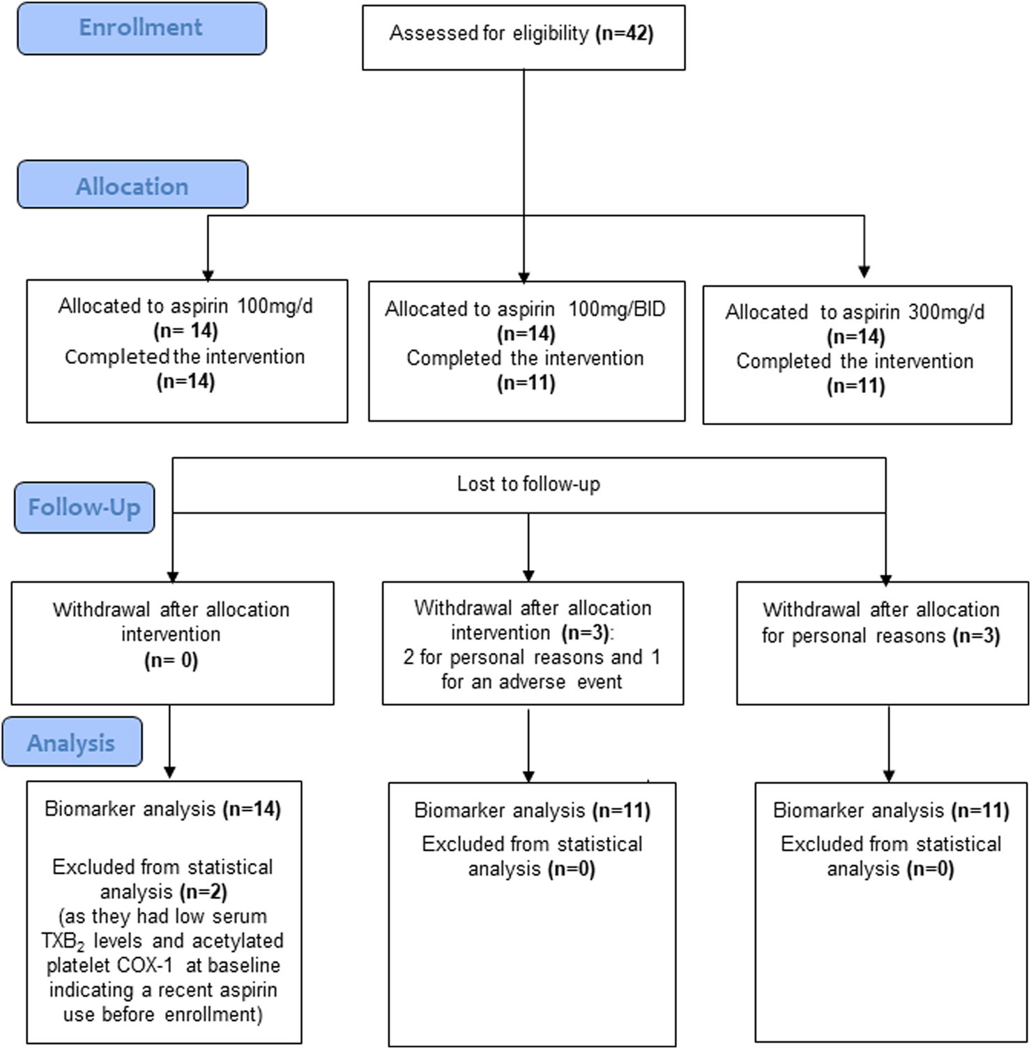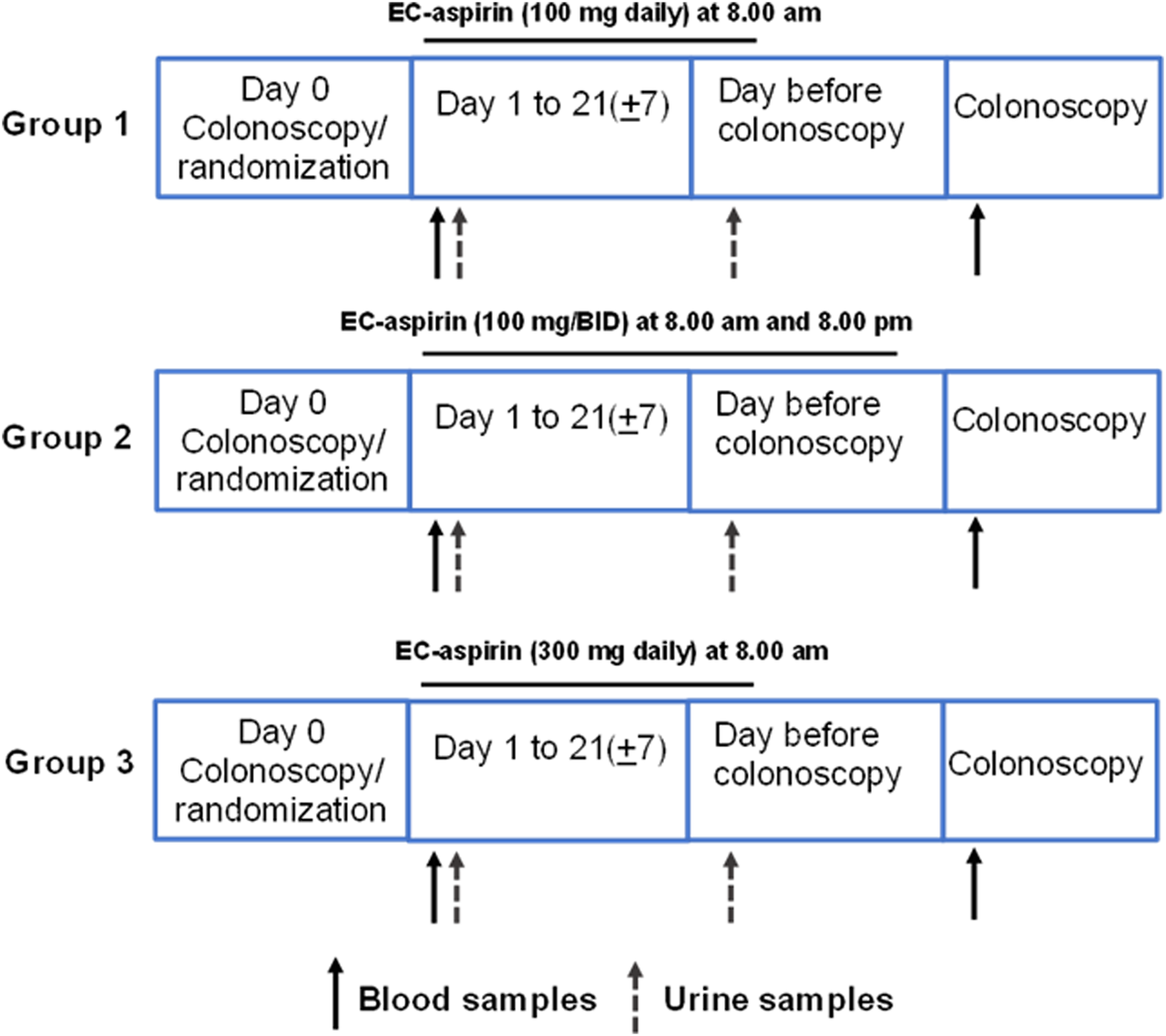 On day 1, at 7 a.m., fasted patients underwent a venous blood sample collection (baseline, pre-drug). Patients were randomized to receive enteric-coated (EC) aspirin 100 mg/d (at 8 a.m.) or, 100 mg BID (at 8 a.m. and 8 p.m.), or 300 mg/d (at 8 a.m.). They were administered the first dose of aspirin (100 mg or 300 mg) at 8 a.m., which was witnessed. The patients were instructed to take aspirin at home for up to 21 ± 7 days. Every five mornings, a researcher phoned to remind them of the drug administration.
