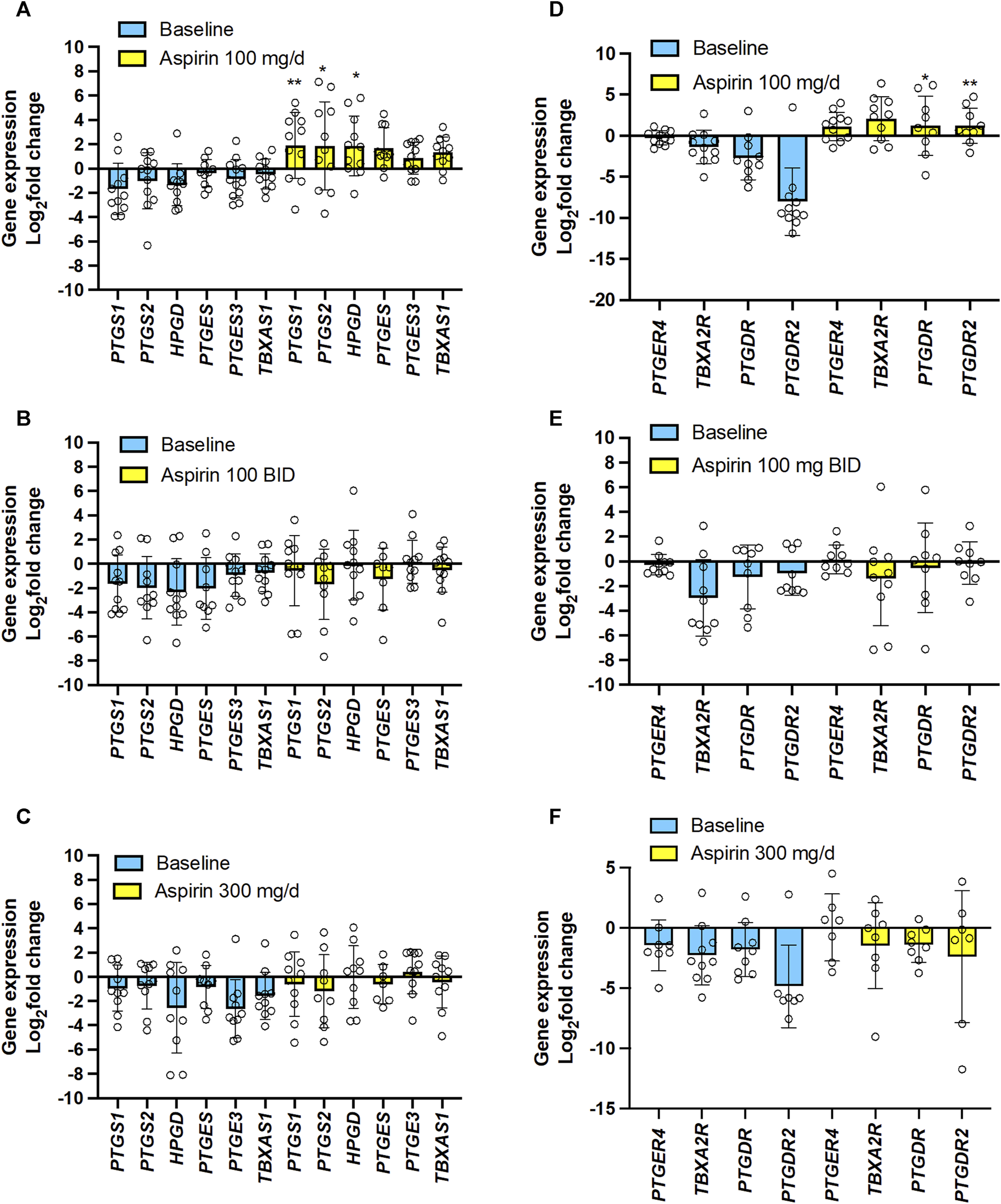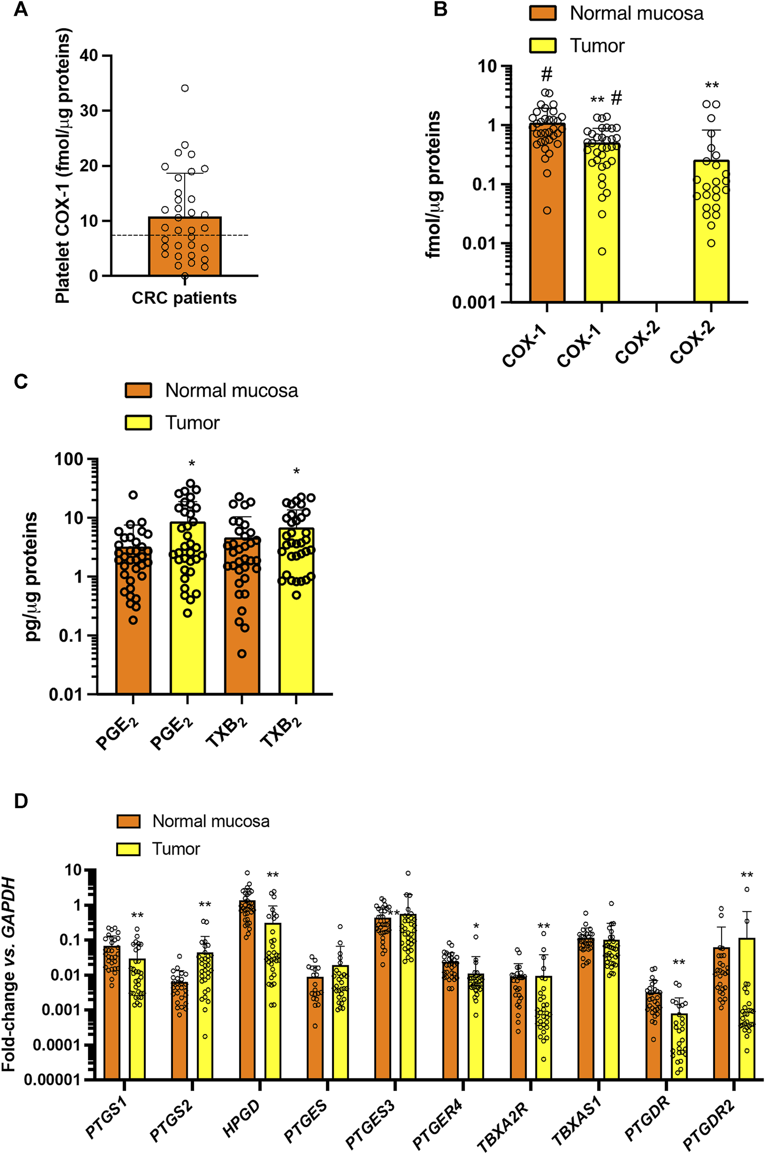 Sample collection and biomarker evaluation. At baseline and after the last Aspirin dose, the following samples were collected: i) urine samples (overnight or 24 h collections), ii) blood samples, and iii) colon tissue biopsies for the assessment of the following biomarkers: (A) systemic biosynthesis of TXA2, PGI2, PGE2, and PGD2 by assessing their urinary primary enzymatic metabolites, i.e., 11-dehydro-TXB2 and 2,3-dinor-TXB2 (TXM), 2,3-dinor-6-keto-PGF1α (PGIM), 7-hydroxy-5,11-diketotetranorprostane-1,16-dioic acid (PGEM), and 11,15-dioxo-9α-hydroxy-2,3,4,5-tetranorprostan-1,20-dioic acid (PGDM), by liquid chromatography-mass spectrometry (LC-MS/MS); (B) platelet COX-1 activity ex vivo by evaluating the production of TXB2 in serum by allowing whole blood to clot for 1 h at 37°C; (C) plasma levels of acetylsalicylic acid (ASA) and salicylic acid (SA) by LC-MS/MS; (D) PGE2 and TXB2 levels in colorectal biopsies of normal and tumor tissue by specific immunoassays; (E) the expression of genes involved in prostanoid biosynthetic pathways and epithelial-mesenchymal transition (EMT) marker genes and GAPDH by qPCR; (F) % acetylation of washed platelet COX-1 at Serine529 and % acetylation of COX-1 at Serine529 and COX-2 at Serine516 in the biopsies of colorectal tumor and normal tissue by LC-MS/MS.
