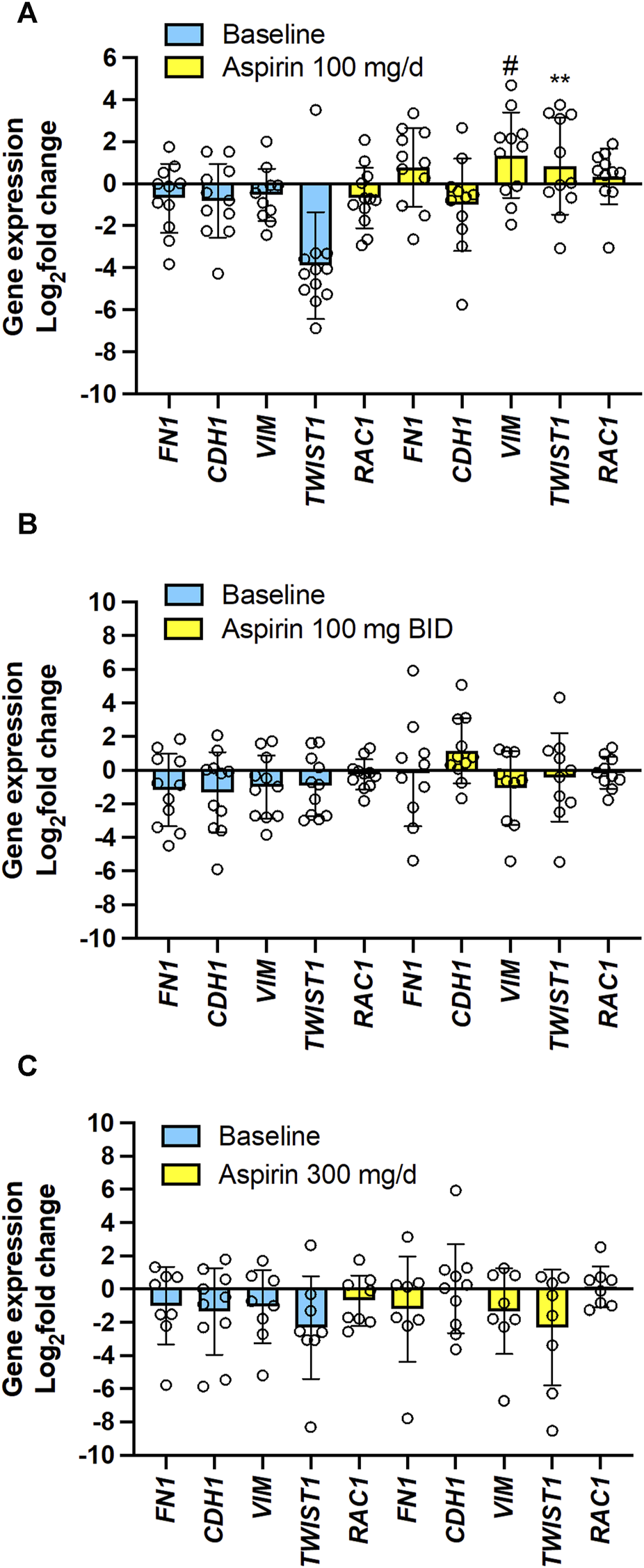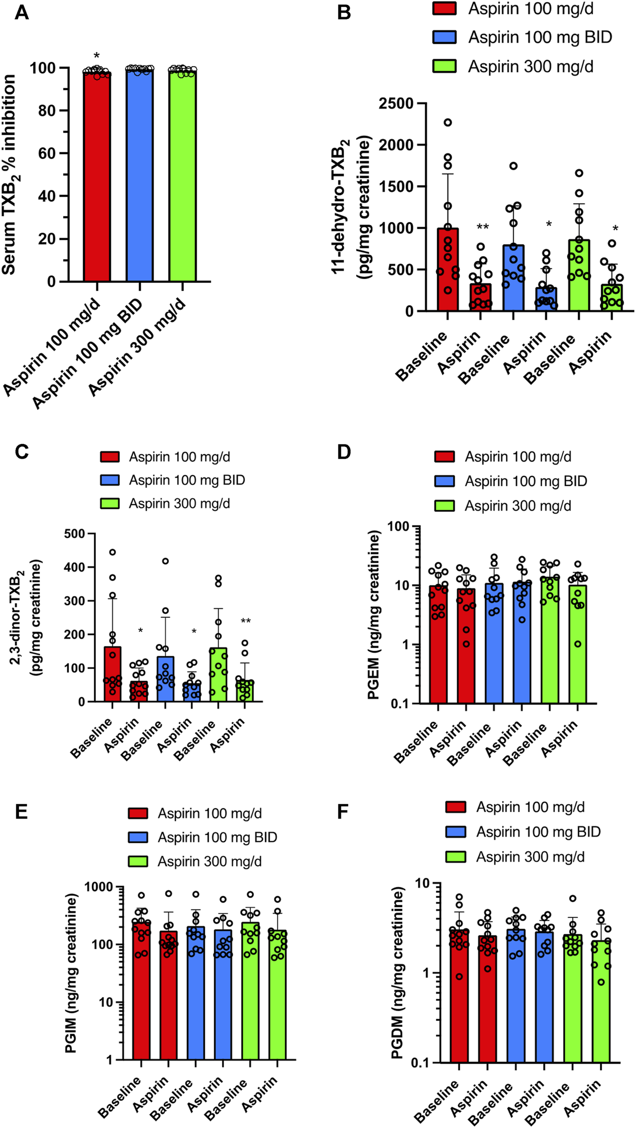 Results: All aspirin doses caused comparable % acetylation of platelet COX-1 at Serine 529 associated with similar profound inhibition of platelet-dependent thromboxane (TX)A2 generation ex vivo (serum TXB2) and in vivo (urinary TXM). TXB2 was significantly reduced in CRC tissue by aspirin 300 mg/d and 100 mg/BID, associated with comparable % acetylation of COX-1. Differently, 100 mg/day showed a lower % acetylation of COX-1 in CRC tissue and no significant reduction of TXB2. Prostaglandin (PG)E2 biosynthesis in colorectal tumors and in vivo (urinary PGEM) remained unaffected by any dose of aspirin associated with the variable and low extent of COX-2 acetylation at Serine 516 in tumor tissue. Increased expression of tumor-promoting genes like VIM (vimentin) and TWIST1 (Twist Family BHLH Transcription Factor 1) vs. baseline was detected with 100 mg/d of aspirin but not with the other two higher doses.