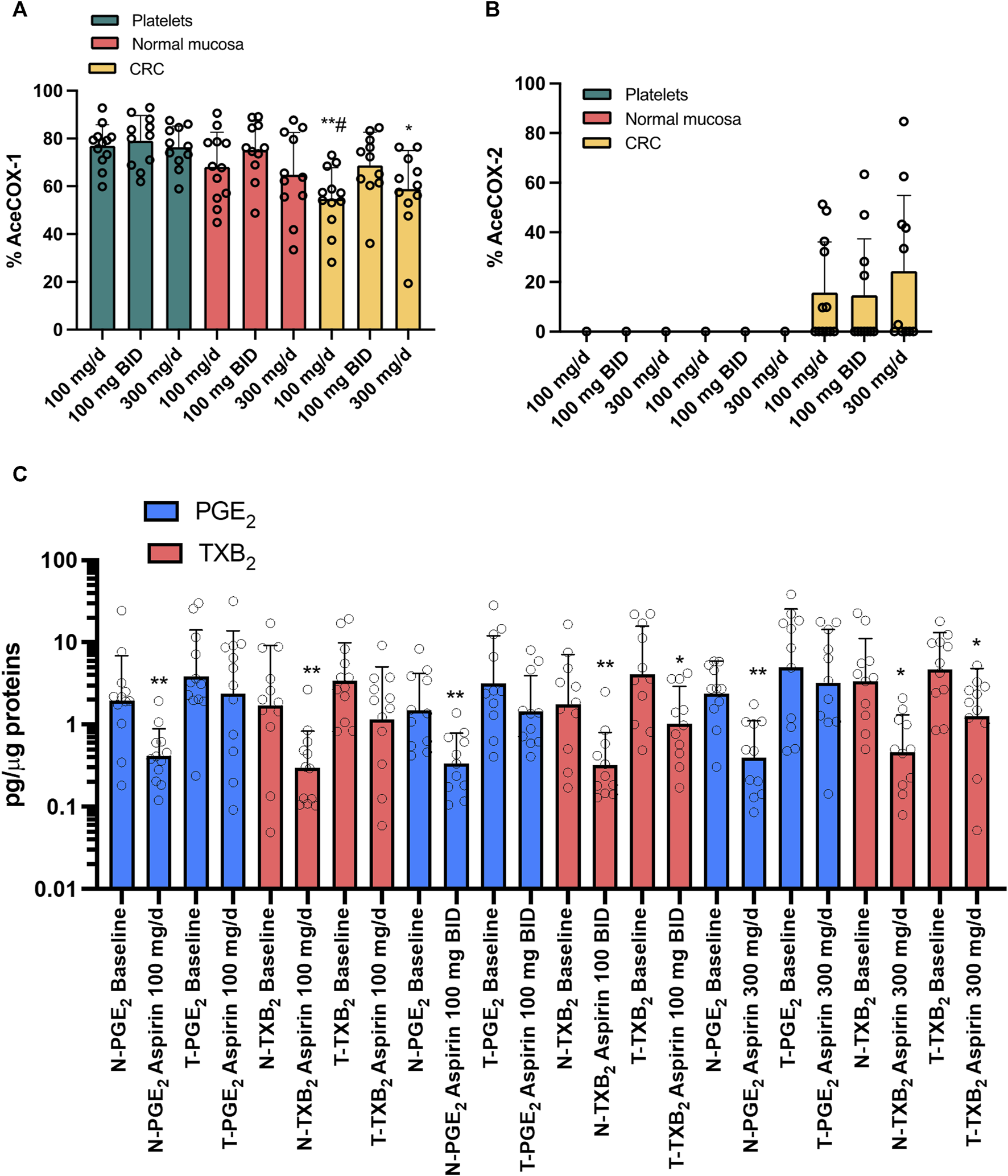 Conclusion: In CRC patients, aspirin 300 mg/d or 100 mg/BID had comparable antiplatelet effects to aspirin 100 mg/d, indicating similar inhibition of the platelet’s contribution to cancer. However, aspirin 300 mg/d and 100 mg/BID can have additional anticancer effects by inhibiting cancerous tissue’s TXA2 biosynthesis associated with a restraining impact on tumor-promoting gene expression. EUDRACT number: 2018-002101-65.