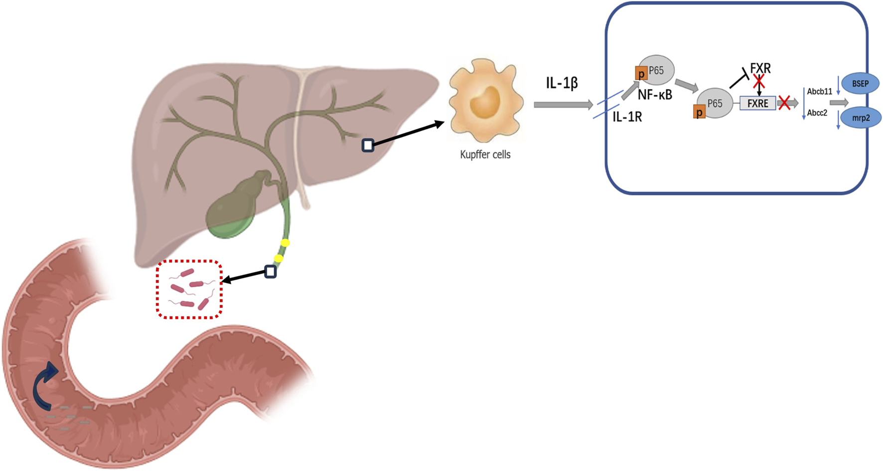 Dysfunction of SO causes recurrence of CBDS. After ERCP, duodenal bacteria entered the biliary system due to dysfunction of SO, which led to disruption of bile acid excretion in hepatocytes by affecting the NF-κB-mediated FXR signalling pathway in the liver.