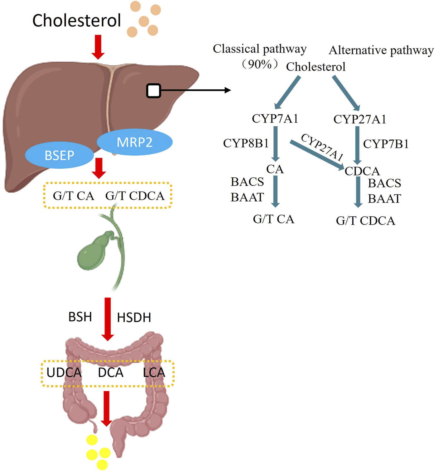 Bile acid synthesis pathway. In the classical synthetic pathway, Cytochrome P450 Family 7 Subfamily A Member 1 (CYP7A1) is the first step and the major rate-limiting enzyme in the classical pathway catalysing bile acid synthesis, followed by generation of cholic acid (CA) and chenodeoxycholic acid (CDCA) by Cytochrome P450 Family 8 Subfamily B Member 1 (CYP8B1) and Cytochrome P450 Family 27 Subfamily A Member 1 (CYP27A1) enzymes, with the classical pathway accounting for 90% of bile acid synthesis. In the alternative pathway, cholesterol is catalysed by CYP27A1 and CYP78B1 to produce CDCA-based bile acids, and the generated CA and CDCA are then modified by bile acid-CoA synthetase (BACS) and bile acid Coenzyme A: amino acid N-acyltransferase (BAAT), and then enter the intestinal tract along with the bile in the form of conjugated bile acids, and in the intestinal tract by bile salt hydrolase (BSH), Hydroxysteroid dehydrogenase (HSDH) to become deoxycholic acid (DCA), lithocholic acid (LCA), ursodeoxycholic acid (UDCA) and other secondary bile acids, and then eliminated from the body.