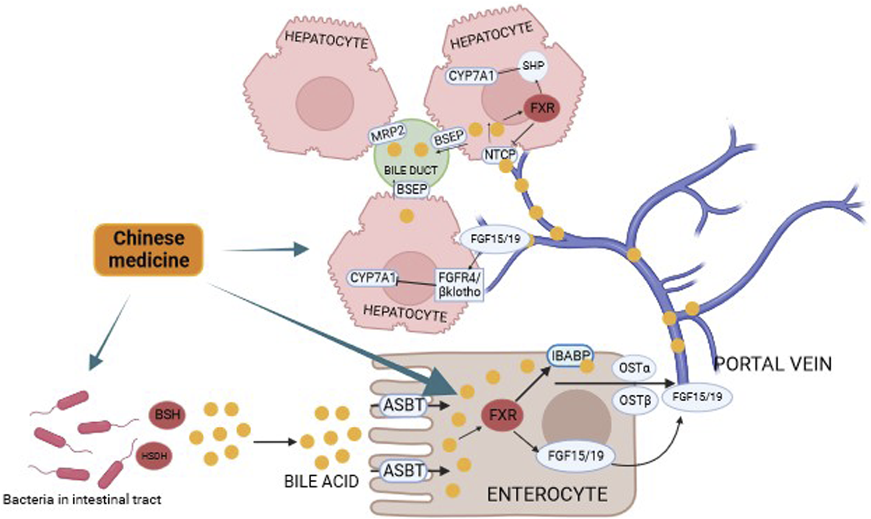 Prevention of CBDS recurrence by regulating the “gut-liver-bile acid” axis in Chinese medicine. Bile acids subjected to bacterial BSH and HSDH are reabsorbed by intestinal cells, and upon binding to FXR in hepatic cells, they affect the classical pathway in the bile acid synthesis pathway by activating the heterodimeric chaperone SHP, which in turn blocks the normal transcription of the CYP7A1 enzyme. Binding to FXR also reduces the concentration of effective bile acids by releasing FGF15/19 to form a heterodimeric complex with FGFR and β-Klotho, which in turn affects the normal transcription of CYP7A1 leading to an abnormality in the pathway of bile acid synthesis.