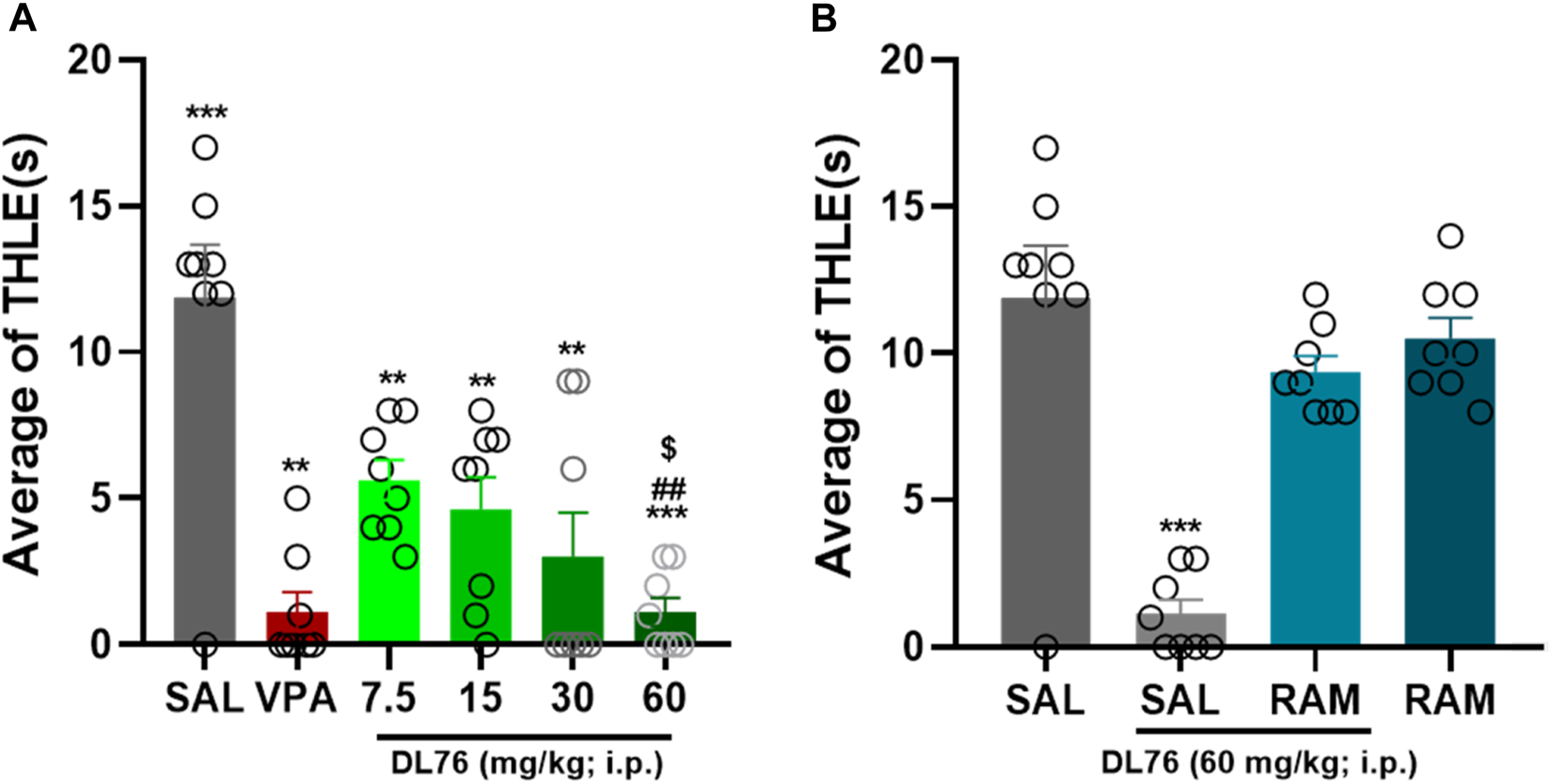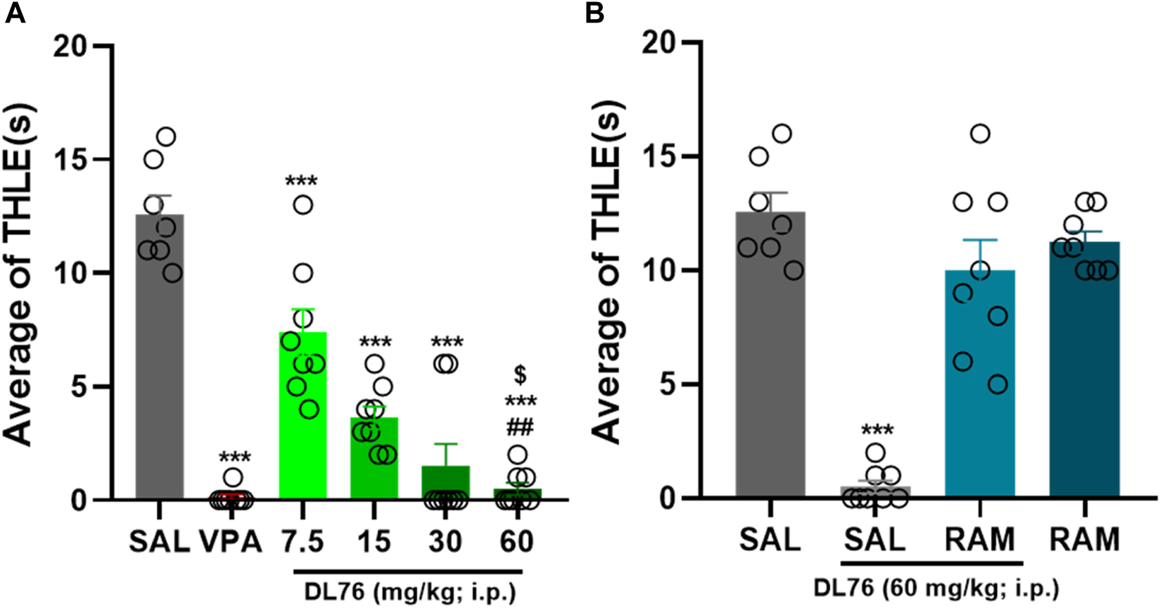 Anticonvulsant effect of acute systemic administration of H3R antagonist DL76 on MES-induced seizure in female adult mice. (A) Anticonvulsant effects of valproic acid (VPA, 300 mg/kg, i.p.) and test compound DL76 (7.5 mg/kg, 15 mg/kg, 30 mg/kg, and 60 mg/kg, i.p.) on the duration of tonic hind limb extension (THLE) induced in an MES model in female adult mice. (B) Effect of CNS-penetrant H3R agonist RAM (10 mg/kg, i.p.) pretreatment on the protection by H3R antagonist DL76 (60 mg/kg, i.p.) on MES-induced convulsions in female adult mice. Each value represents mean ± SEM (n = 8). ***p < 0.001 versus saline- and DL76 (7.5 mg/kg)-treated groups. ##p < 0.001 versus DL76 (7.5 mg/kg)- and DL76 (15 mg/kg)-treated groups. $p < 0.05 versus DL76 (30 mg/kg)-treated group.