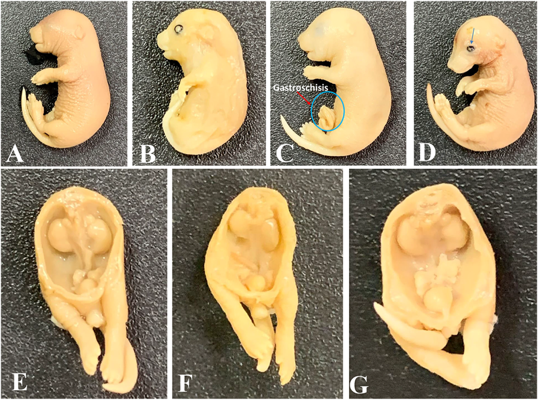Some abnormalities detected in tested mice embryos at gestational day 18. (A) Normal embryo; (B) mandibular and maxillary hypoplasia with an open eye; (C) embryo with gastroschisis; (D) intrauterine growth restriction (IUGR) and open eye; (E) normal urogenital system; (F) embryo with a hypoplastic right kidney and a descended left kidney; (G) embryo with undescended testes. Magnification: ×1.25.