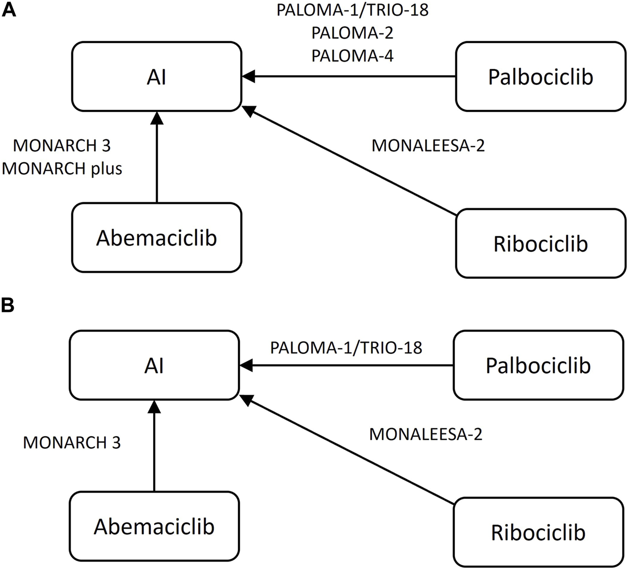Network plot of included randomized controlled trials (A) progression-free-survival, (B) overall survival AI, aromatase inhibitor, letrozole or anastrozole.