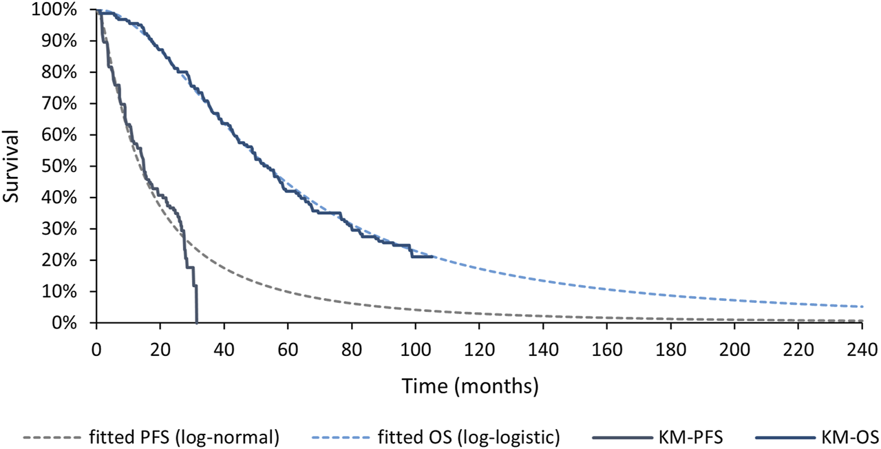Fitted Survival Curves for PFS and OS of MONARCH 3 aromatase inhibitor arm. PFS, progression-free survival; OS, overall survival; KM, Kaplan-Meier.