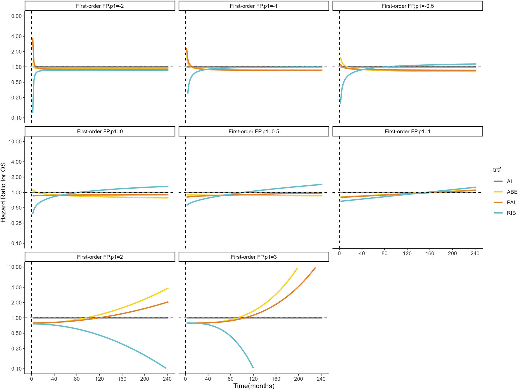 HR was analyzed using first-order fractional polynomial model, and Table 2 gives information about the different first-order FP models, including AIC values. However, NICE DSU 21 suggests that a minimum AIC may be help in selecting a model that fits the data within the length of follow-up, but the AIC provides little information about how well the model extrapolates to longer time points (Rutherford et al., 2020). When fitting the immature survival data, the fitting model with the minimum value of AIC may have the problem of over-fitting to the tail data. Therefore, we select the best model through Akaike Information Criteria (AIC) and visual inspection.