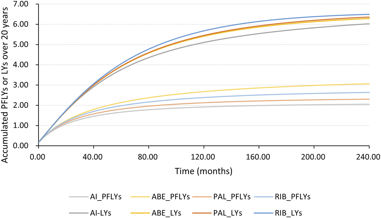 PFLYs and LYs calculated by the AUC of the survival curve, accumulated over 20 years AI, aromatase inhibitor; ABE, abemaciclib; PAL, palbociclib; RIB, ribociclib; PFLYs, progression-free life years; LYs, life years.