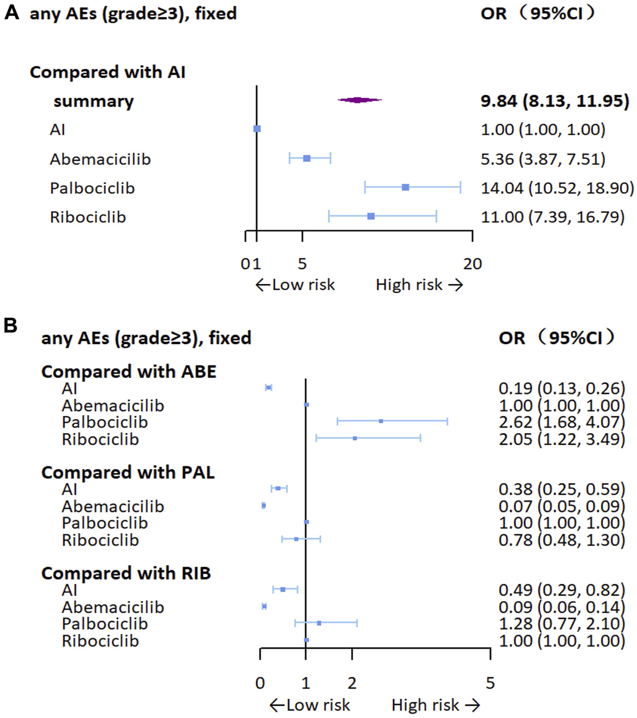 Forest plots for any grade≥3 adverse events. (A) Compared with AI, (B) compared with the inhibitors AI, aromatase inhibitor; ABE, abemaciclib; PAL, palbociclib; RIB, ribociclib.