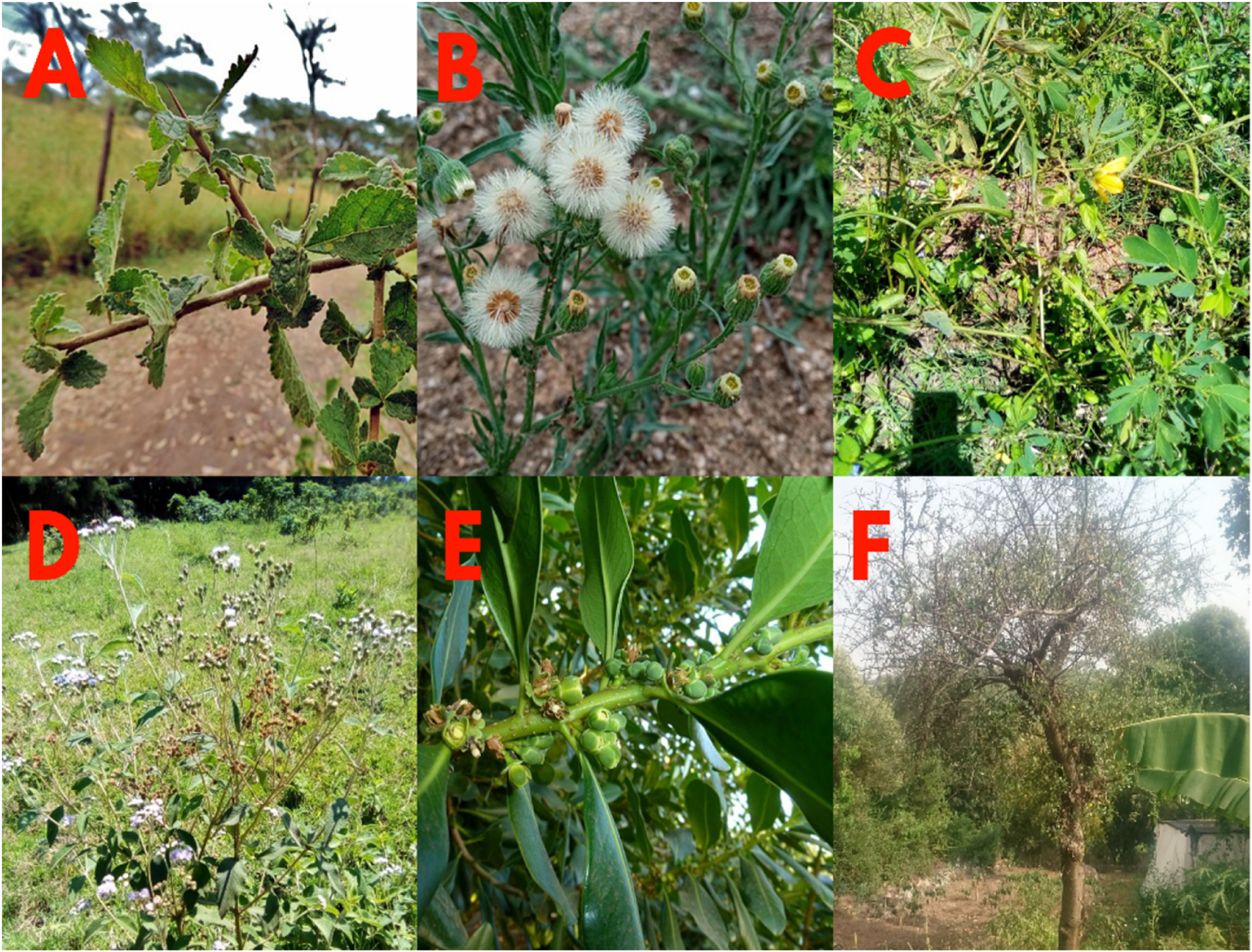 Photos of Commiphora africana (A. Rich) Engl (A), Conyza bonariensis (L.)., Cronquist (B), Senna obtusifolia (L.) Irwin and Barneby (C), Vernonia glabra (Streetz) (D), Warburgia ugandensis (Sprague) (E), and Zanthoxylum usambarense (Engl.) Kokwaro (F) used in this study.