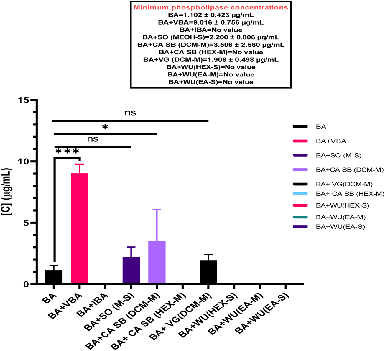 | Dichloromethane | No activity | No activity | 33.20 ± 6.89 | No activity | 10.99 ± 2.87 | 16.59 ± 4.56 | ||
