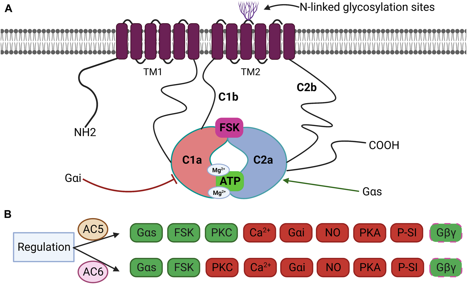 (A) Schematic structure of transmembrane adenylyl cyclases (TMACs). TMACs contain an intracellular N-terminus, two repetitions of six TM1 and TM2, and two cytoplasmic domains (C1 and C2) further divided into C1a and C2a. C1a–C2a forms the catalytic domain and FSK-binding site. Inhibitor Gαi binds to C1a, whereas activator Gαs binds to C2a. C1b and C2b are regulatory subdomains, and the N-terminus participates in several protein–protein interactions. Some isoforms are glycosylated on extracellular loops 5 or 6. (B) Specific regulation of AC5 and AC6 by various effectors. Both isoforms are fully activated by Gαs and FSK and partially or conditionally activated by Gβγ. AC5 is activated by PKC, whereas AC6 in inhibited by PKC. Both isoforms are inhibited by Ca2+, Gαi, NO, PKA, and P-site inhibitors (P-SI). Green: stimulation, red: inhibition, and dashed line: conditionally.