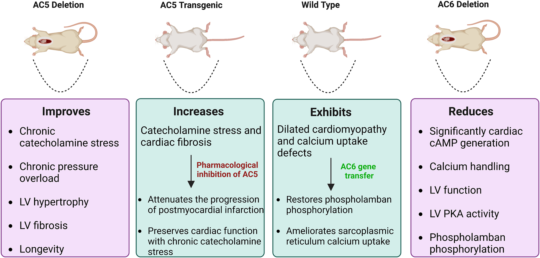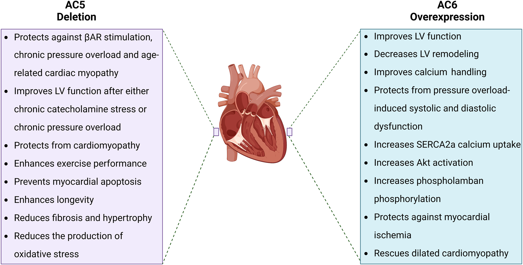 Pathophysiological effects of AC5 deletion and AC6 overexpression. AC5 and AC6 behave distinctly when increased or disrupted. While AC5 deletion has come with several beneficial effects for the heart such as prolonged longevity and enhanced LV function, AC6 overexpression improves cardiac cAMP generation and Ca2+ handling, resulting in improved LV function.