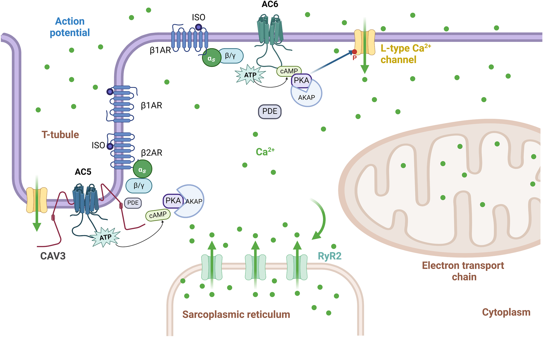 Schematic representation of the localization of AC5 and AC6 signaling within the t-tubule and sarcolemmal membrane. In ventricular myocytes, AC6 is localized to the plasma membrane outside of the t-tubular region, and it interacts only with β1AR signaling-mediated augmentation of the L-type Ca2+ current (ICa,L), while AC5 is localized to the membrane in t-tubular regions, and its function on ICa,L is restrained by cAMP degradation by phosphodiesterases. Adapted from (Timofeyev et al., 2013); image designed using BioRender.