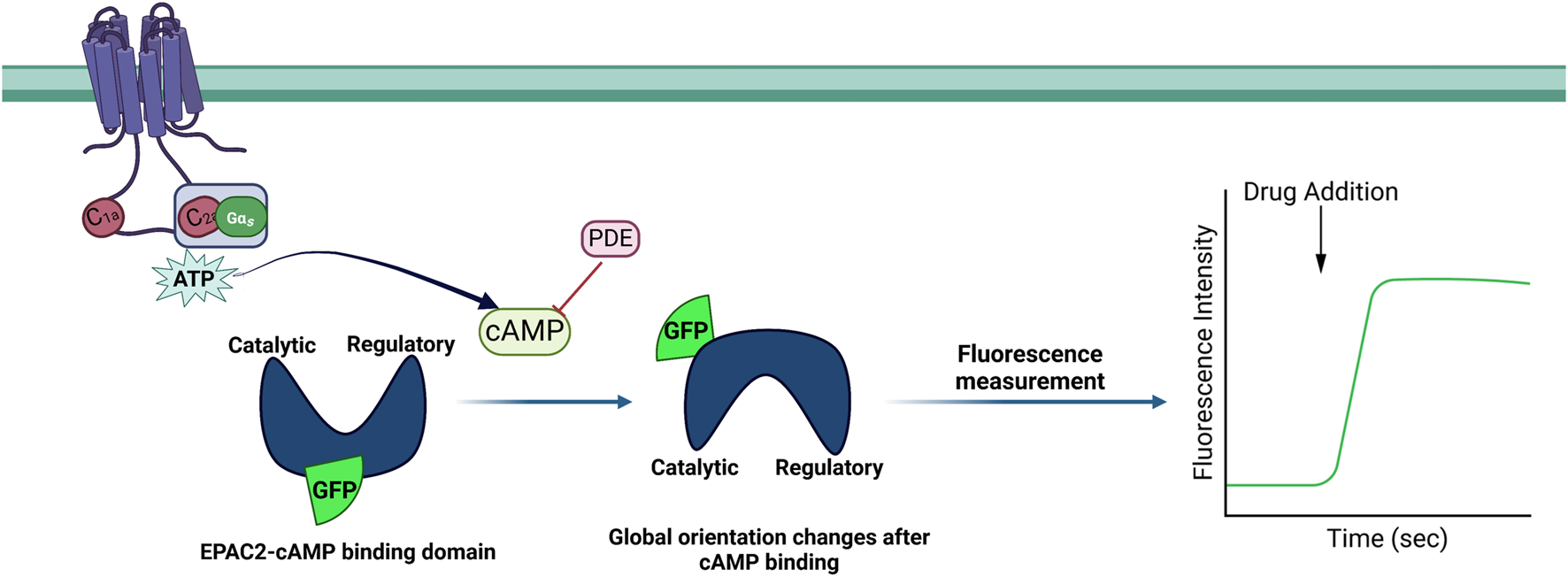 A newer, versatile approach for measuring cAMP after Gαs- or Gαi-mediated signaling is the cAMP difference detector in situ (cADDis) assay (schematic representation, Figure 5). This sensor uses a single fluorescent protein, the Epac cAMP-binding domain fused to circularly permuted mNeonGreen and red mMaple, resulting in a readily detectable bright green fluorescence signal; the Upward cADDis sensor manifests a rise in green fluorescence with increased cAMP, while Downward cADDis decreases fluorescence in response to increased cAMP (Tewson et al., 2018). The cADDis sensor is capable of differentiating basal cAMP from that stimulated by receptor agonism as well as cAMP changes due to Gαs or Gαi activation, when expressed in HEK293T cells (Tewson et al., 2018). Due to its robust expression in multiple cell types and ability to measure real-time cAMP kinetics in live cells over long periods of time with little loss of sensor signals, cADDis has been used in many recent studies of AC cAMP production (Baldwin et al., 2019; Bhatia et al., 2023; Cattani-Cavalieri et al., 2023; Ripoll and Von Zastrow, 2023). Other transfectable single-fluorescent protein cAMP sensors in use include fluorescent cAMP indicator (Flamindo) (Odaka et al., 2014), red fluorescent indicator for cAMP (R-FlincA) (Ohta et al., 2018), and cAMPr (Hackley et al., 2018).