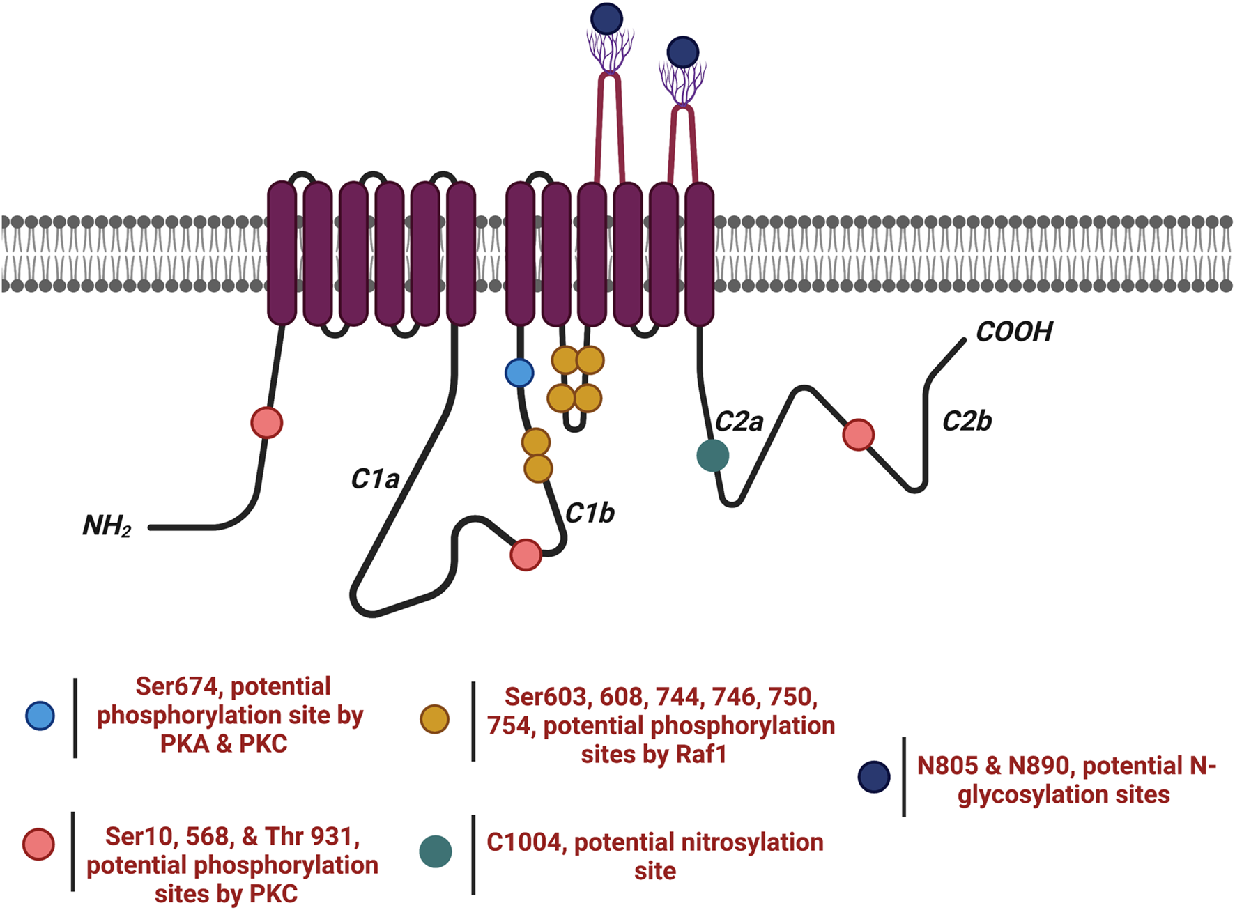 ); and glycosylated at N805 and N890 on extracellular loops 5 and 6.