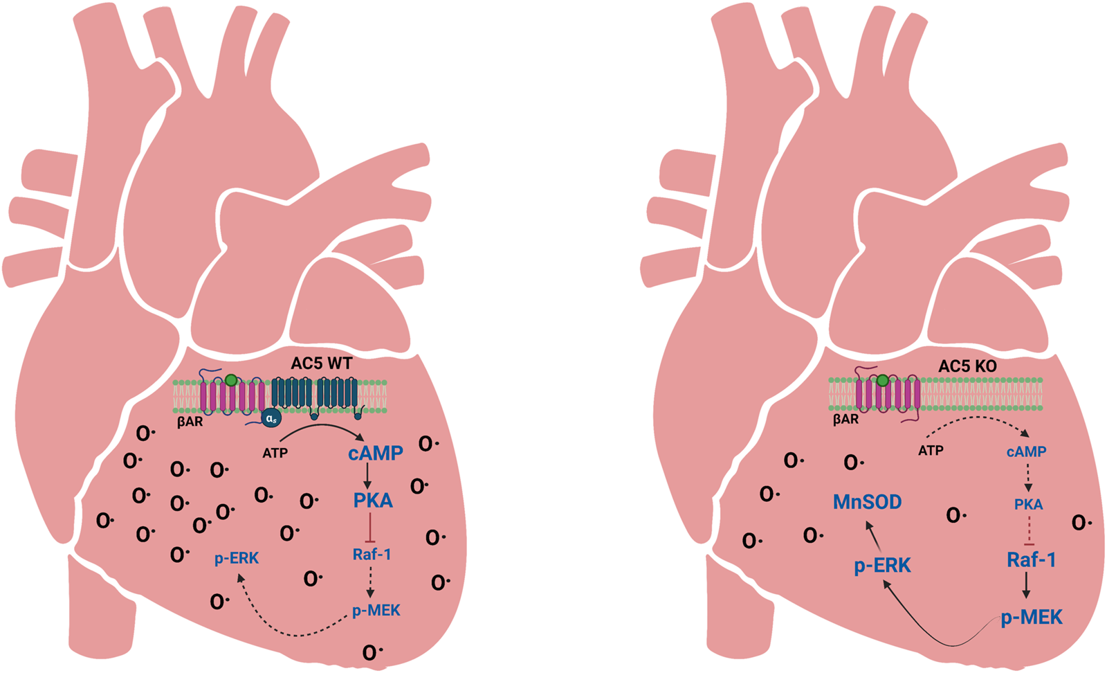 Depiction of AC5 signaling effects on cellular antioxidant imbalances in AC5WT and AC5KO hearts. When AC5 is disrupted (AC5KO), there is less βAR-stimulated cAMP, which decreases PKA activity. Lack of PKA leads to the activation of the Raf-1/MEK-ERK signaling pathway to increase the expression of MnSOD. This results in attenuation of oxidative stress. MnSOD antioxidant defense is not as present in AC5WT. O• indicates oxidative stress. Adapted from (Chester and Watts, 2007); image designed using BioRender.
