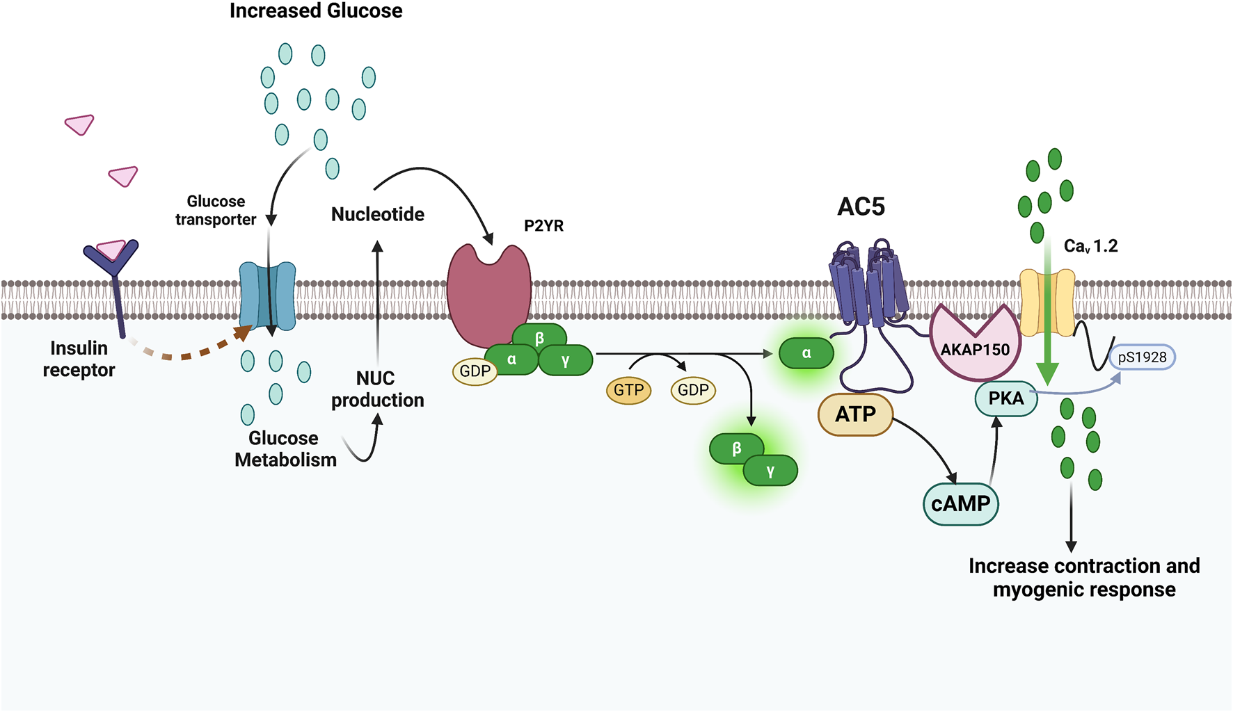 Involvement of AC5-mediated localized cAMP generation in diabetes and extracellular glucose activation of L-type Ca2+ channels and vasoconstriction. The illustration shows how glucose regulates L-type Ca2+ channel activity and vascular reactivity in an AC5-dependent manner. Increases in extracellular glucose can trigger P2YR linked to Gαs signaling through extracellular nucleotide signaling because of transport and metabolism. Because AC5 and CaV1.2 are close in proximity, this cAMP microdomain may stimulate a pool of AKAP150-anchored PKA that is jointly linked to CaV1.2, making it to become more phosphorylated at Ser1928 and increasing channel function. Adapted from (Syed et al., 2019); image designed using BioRender.