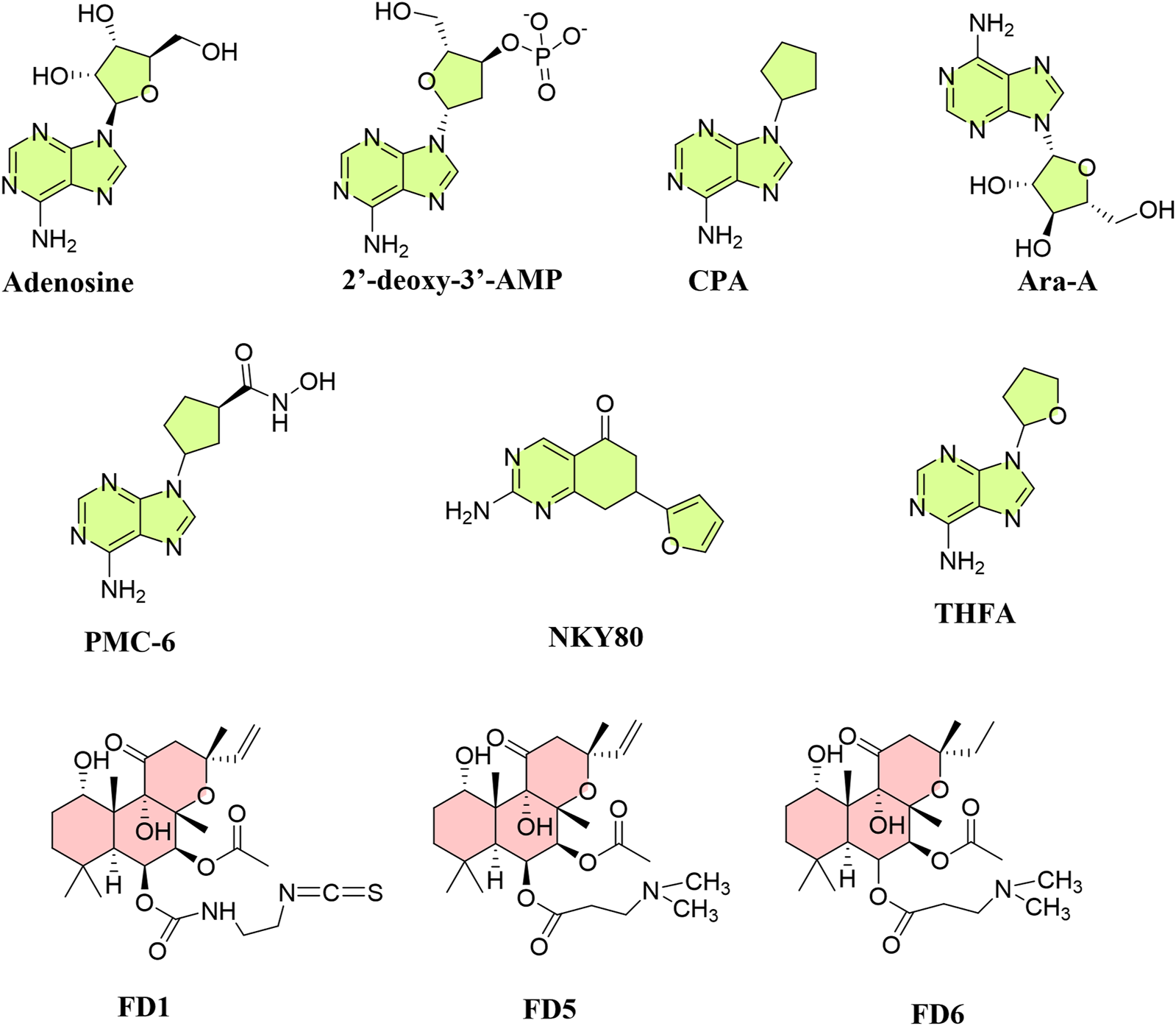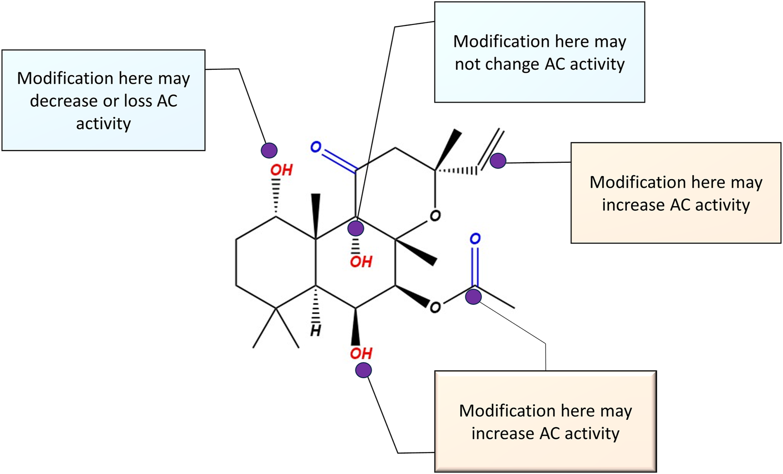 To design selective AC5 and AC6 activators, maintaining hydrogen bonding of FSK C1-OH, C7-acetyl, and C9-OH has been deemed crucial (Onda et al., 2001). There has also been specific focus on modification of C6 and C7 positions, due to a large open area apparent from AC crystallographic studies (Tesmer et al., 1997), suggesting that modification on these FSK positions may increase AC activity with selectivity and/or specificity. Figure 10 illustrates the possible sites of modifications for designing novel AC5 or AC6 activators. It is important to note that many of the earlier studies which established FSK positions suitable for modification evaluated only a subset of the AC isoforms. Testing of candidate compounds on each AC isoform remains necessary to determine which site is particular to each isoform.