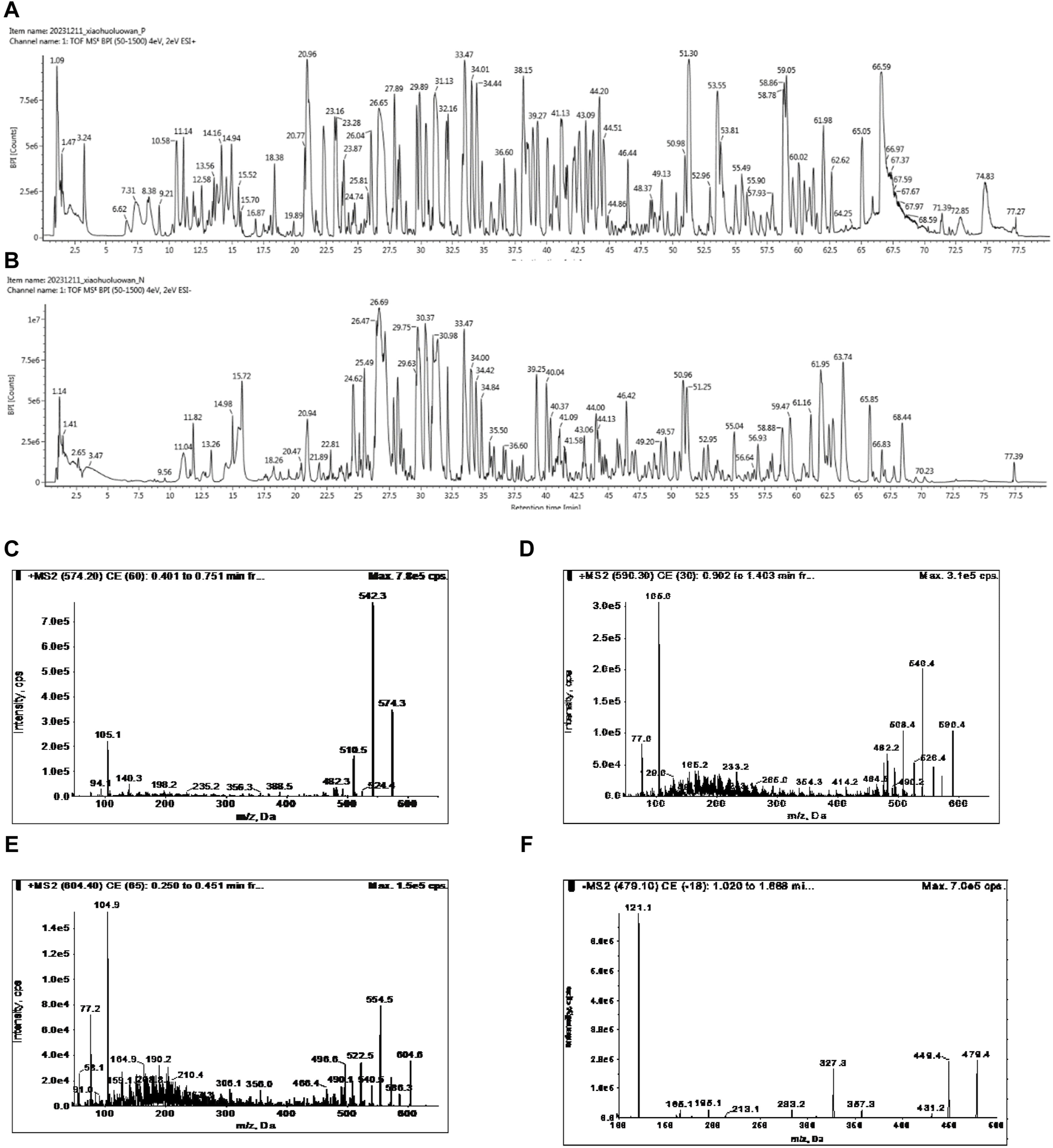 UPLC-MS/MS analysis of chemical compounds in FFXHL in (A) Total ion current (TIC) chromatogram of FFXHL under positive ion mode. (B) TIC chromatogram of FFXHL under negative ion mode. Tandem mass spectrometry (MS/MS) spectra of (C) Benzoylhypacoitine. (D) Benzoylmesaconine. (E) Benzoylaconitine. (F) Paeoniflorin.