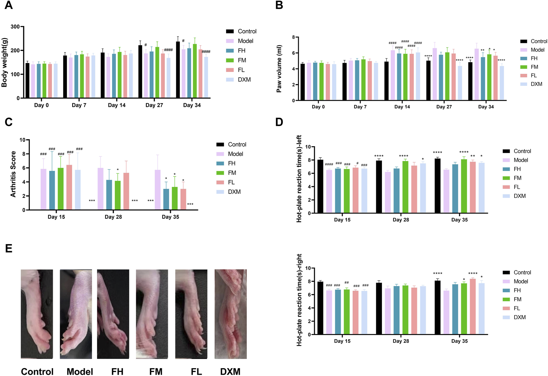 Behavioural assessment of anti-arthritic activity of FFXHL in the CIA rats. (A) Body weight. (B) Paw swelling. (C) Arthritis Score. Hind paws assigned a severity score of 0–4. (D) Hot-plate reaction times right and left. (E) Macroscopic evidences of arthritis in different groups of rats were observed on day 36. The data are expressed as means ± SEM, #p < 0.05, ##p < 0.01, ###p < 0.001, ####p < 0.0001 vs. control group; *p < 0.05, **p < 0.01, ***p < 0.001, ****p < 0.0001 vs. Model, n = 7. FH: FFXHL high dose; FM: FFXHL medium dose; FL: FFXHL low dose.