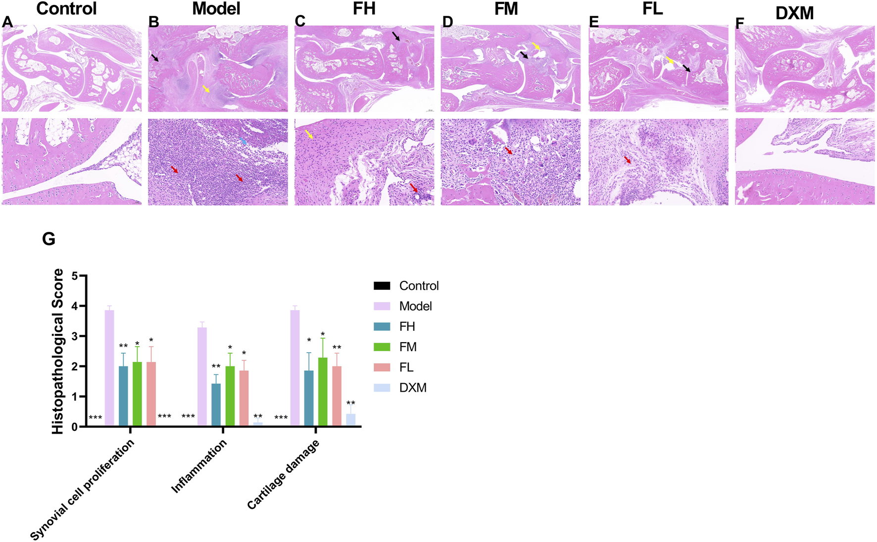 To evaluate the impact of FFXHL on joint damage in CIA rats, histopathological changes were examined, including synovial cell proliferation, inflammation, and cartilage damage. As shown in Figure 3A, the articular cartilage surface in the control group was smooth, the morphology and structure of the chondrocytes are normal, without noticeable synovial hyperplasia or inflammation in the synovial tissue. In contrast, the model groups (Figure 3B) exhibited large amount of bone tissue necrosis and dissolution visible, replaced by extensively proliferated connective tissue (black arrow). There is severe proliferation of the synovium on both sides (yellow arrow) and severe inflammatory cells infiltration (red arrows) and some of them have infiltrated into the joint cavity (blue arrow). Treatment with FFXHL (Figures 3C,D,E) and DXM (Figure 3F)markedly reduced these histological abnormalities (Figure 3G). In FH, FM and FL groups, there was a noticeable reduction in bone necrosis and dissolution. Additionally, these groups showed minimal synovial thickening and only a modest presence of infiltrative inflammatory cells.