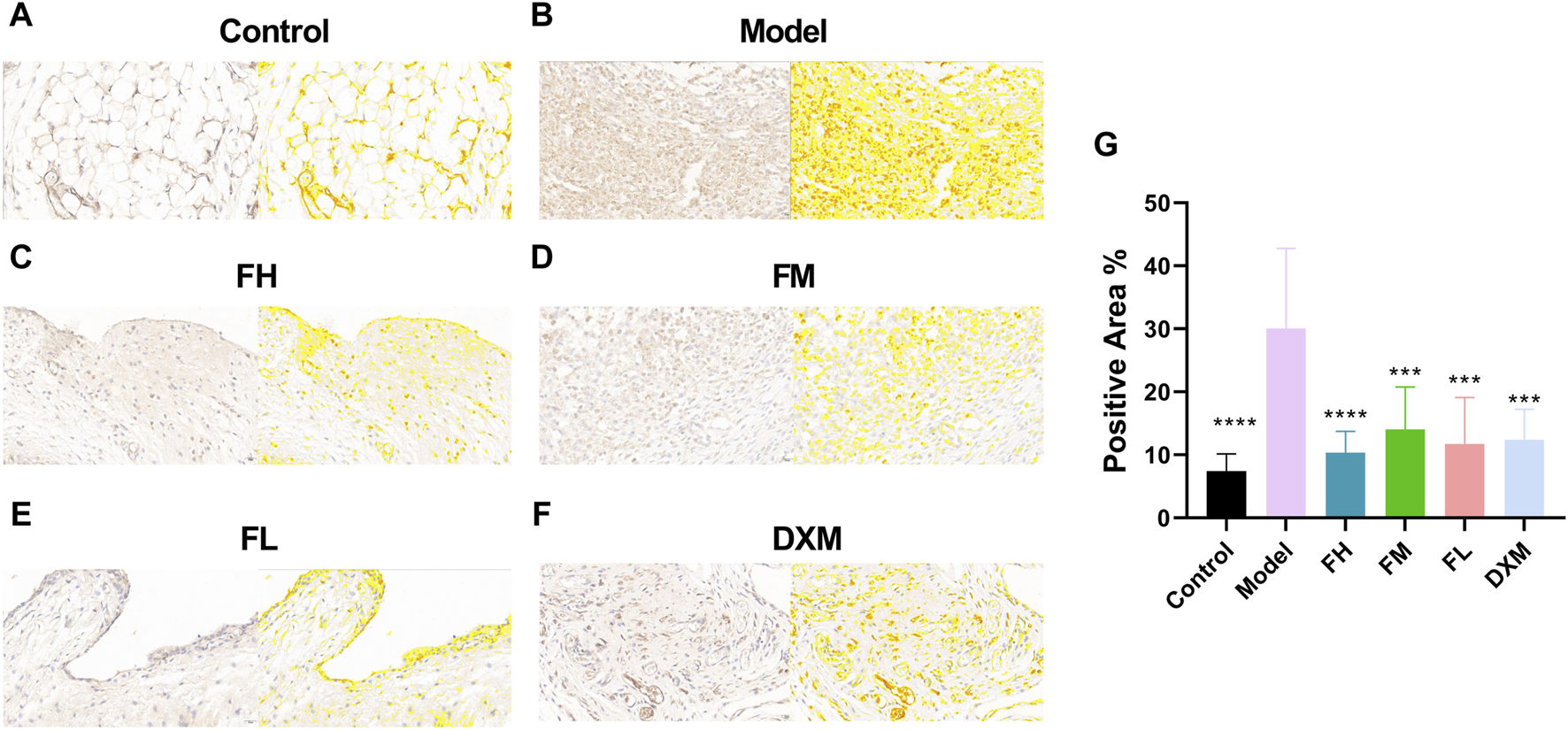 Immunohistochemistry analysis of NF-κB p65 in the joint of CIA rats. The pictures (A–F) Displayed immunohistochemical sections of the joints from the different treatment groups for NF-κB p65 (40.0x). Immunohistochemistry analysis was quantified by measuring the mean optical density (OD) of each image. (G) Immunohistochemistry analysis were quantified by measuring the positive area of each image. Values were presented as means ± SEM. **p < 0.01, ***p < 0.001, ****p < 0.0001 vs. Model. n = 6. FH: FFXHL high dose; FM: FFXHL medium dose; FL: FFXHL low dose.