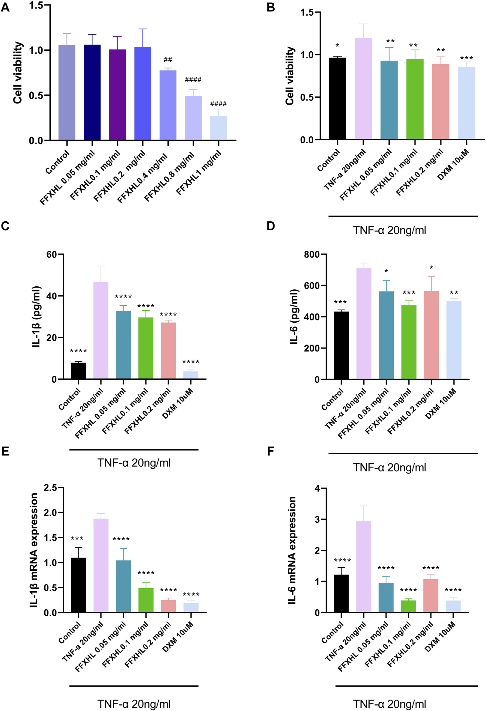 Effects of FFXHL on TNF-α induced pro-inflammatory cytokine production and cell proliferation. For A, MH7A cells treated with different concentrations of FFXHL for 24 h. For B–G, MH7A cells were pre-treated with FFXHL for 24 h and then stimulated with 20 ng/mL TNF-α. (A) The effect of different concentrations FFXHL on MH7A cell viability. (B) The effects of FFXHL on TNF-α induced cell proliferation. (C–D) Effects of FFXHL on TNF-α induced pro-inflammatory cytokine IL-1β and IL-6 production. (E–F) The mRNA expression of IL-1β and IL-6. The data are expressed as means ± SEM, ##p < 0.01, ####p < 0.0001 vs. control; *p < 0.05, **p < 0.01, ***p < 0.001, ****p < 0.0001 vs. TNF-α 20 ng/mL.