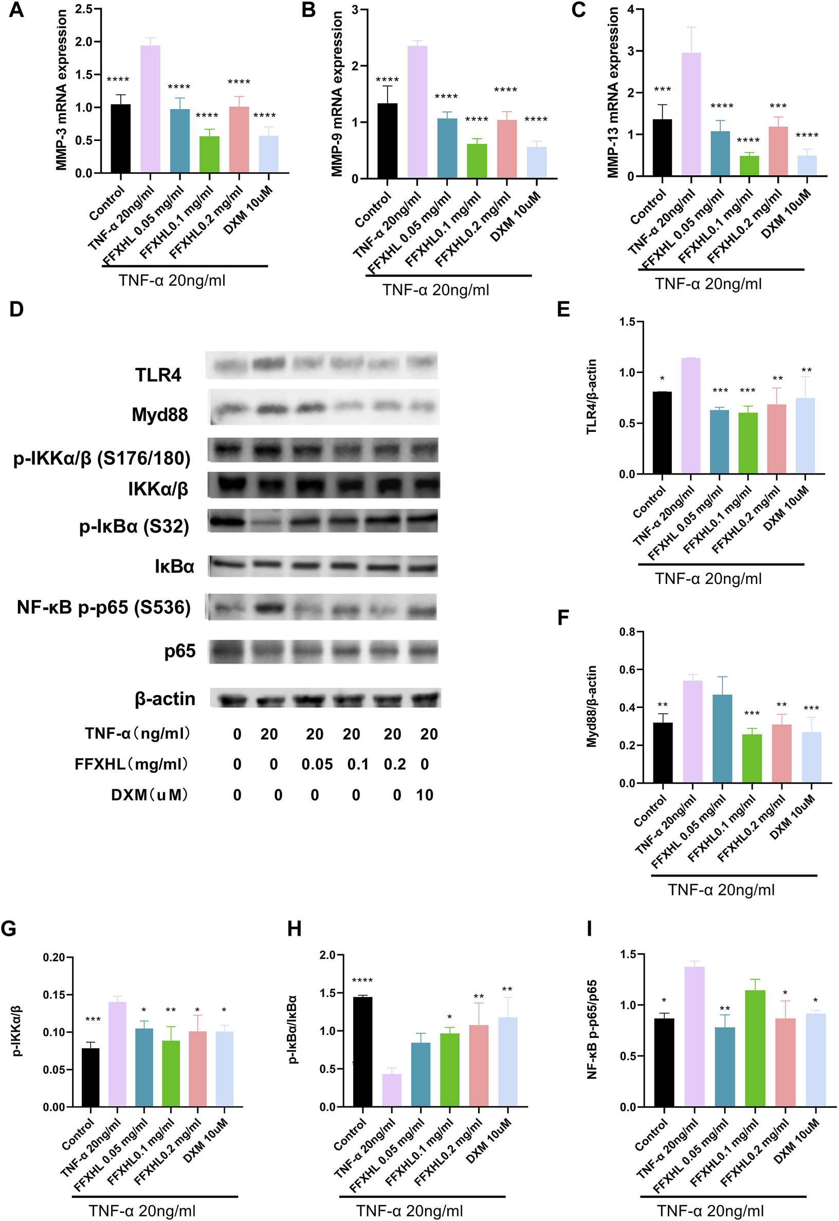 FFXHL inhibited the mRNA expression of MMP-3 (A), MMP-9 (B) and MMP-13 (C) in TNF-α stimulated MH7A cells. Western blot analysis of different proteins in MH7A cells pre-treated with different concentrations of FFXHL for 24 h, then the cells were stimulated with 20 ng/mL TNF-α for 24 h. (D) Grey values of the TLR4, Myd88, p-IKKα/β, IKKα/β, p-IκBα, IκBα, NF-κB p-p65, p65 bands. (E–I) A graphic representation of protein expression of TLR4/Myd88/NF-κB pathway. The data are expressed as means ± SEM, *p < 0.05, **p < 0.01, ***p < 0.005, ****p < 0.0001 vs. TNF-α 20 ng/mL.