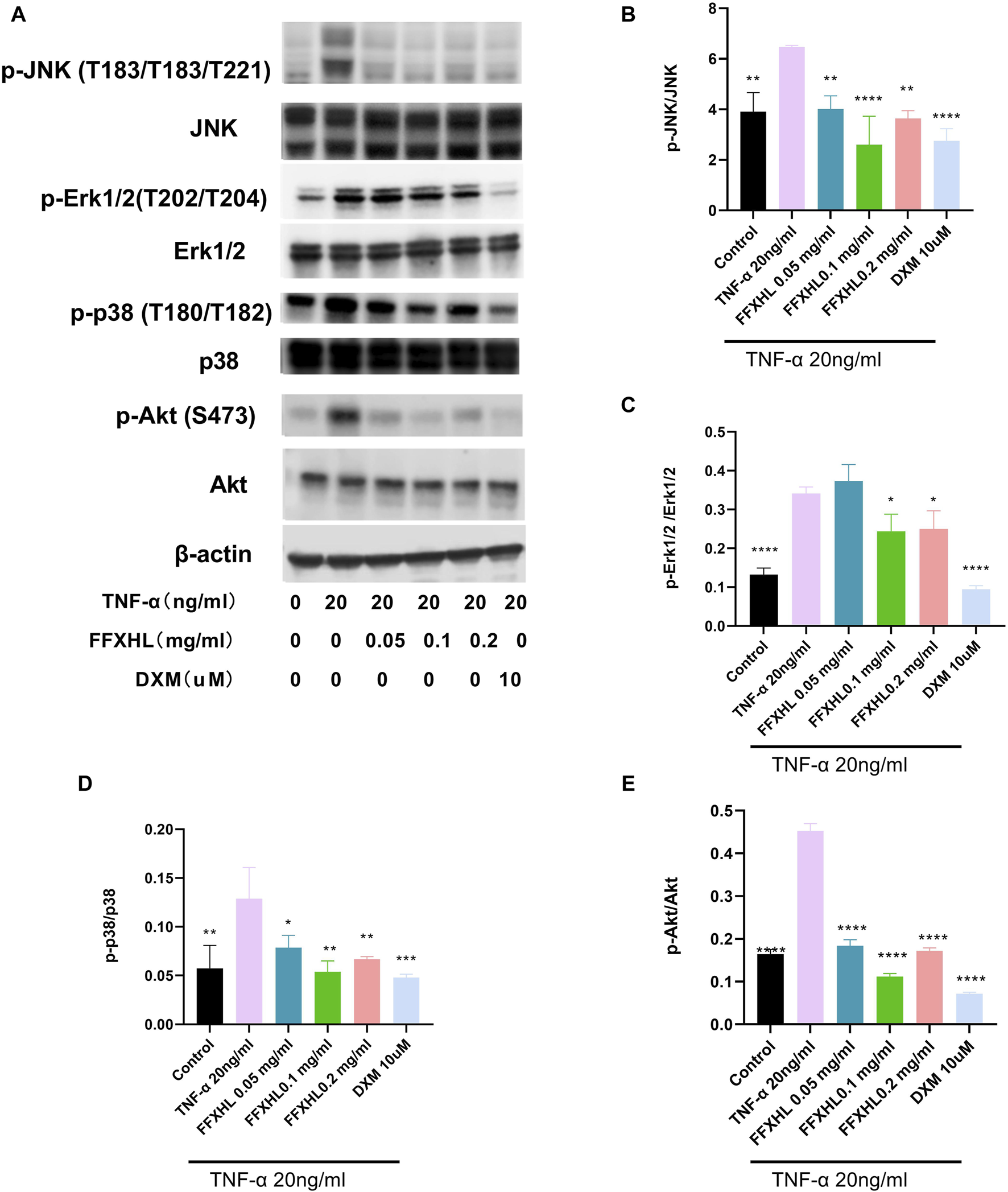 Western blot analysis of different proteins in MH7A cells pre-treated with different concentrations of FFXHL for 24 h, then the cells were stimulated with 20 ng/mL TNF-α for 24 h. (A) Gray values of the p-JNK, JNK, p-Erk1/2, Erk1/2, p-p38, p38, p-Akt, Akt. (B–E) A graphic representation of protein expression of JNK, Erk1/2, p38 and Akt. The data are expressed as means ± SEM, ***p < 0.005, ****p < 0.0001 vs. TNF-α 20 ng/mL.