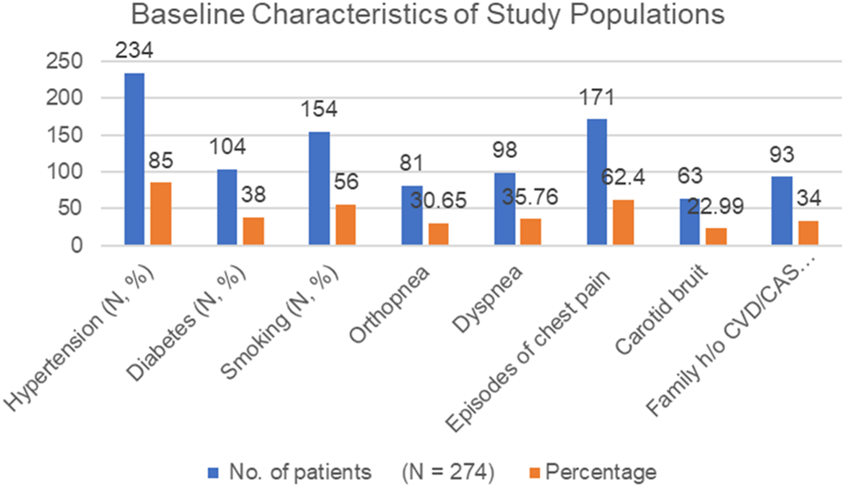Figure 1 shows the baseline characteristics of the study population. As observed, out of 274 study subjects, 187 were male and the remaining 87 were female, out of which 85% (234) subjects were found to have hypertension and 104 (38%) were diabetic. 154 subjects (56%) had smoking habits. 81 patients (30.65%) had problems of orthopnea; shortness of breath that occurs when lying flat, 98 (35.76%) had dyspnea; difficult or labored breathing when walking or climbing stairs. 171 patients (62.40%) were detected with sporadic episodes of chest pain and 63 patients (22.99%) were diagnosed with carotid bruit (vascular sound that is usually heard with a stethoscope over a carotid artery). 56% (154) had smoking habit and 27% of the study population had a history of coronary artery stenosis/cardiovascular disorder (Figure 1).