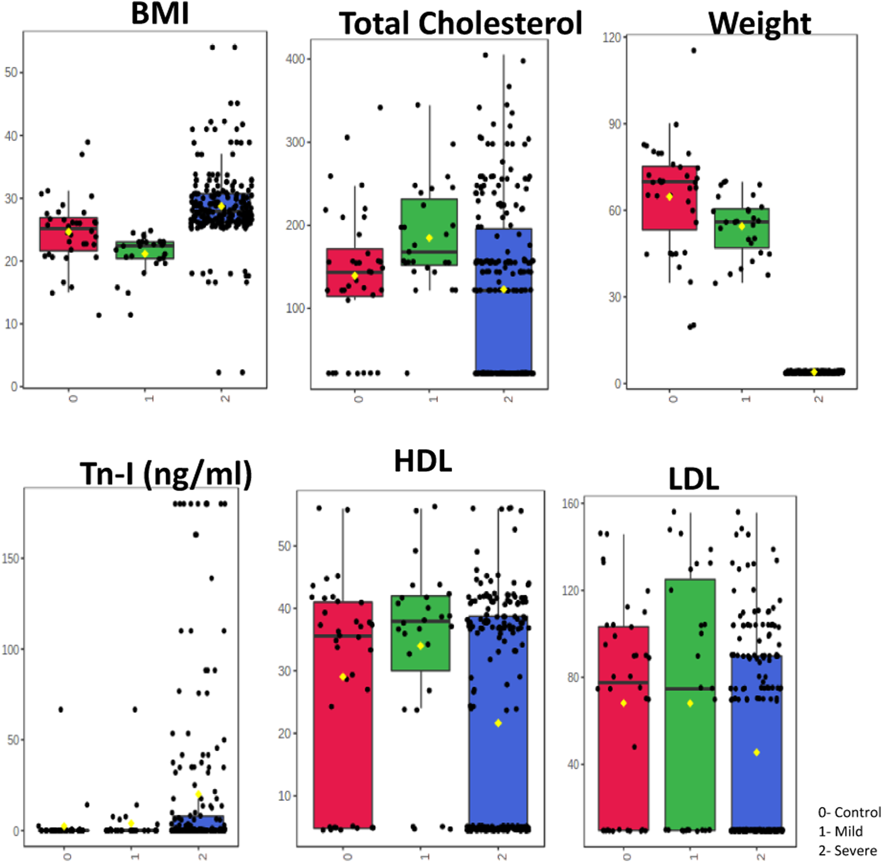 One-way Anova. One-way Analysis of Variance (ANOVA) was employed to investigate the profile of different parameters such as BMI, Weight, Tn-I, total cholesterol, HDL, LDL, among patients with carotid artery. ANOVA was followed by a post hoc analysis (Fischer LSD) to identify potentially significant parameters that can discriminate between controls, mild and severe.