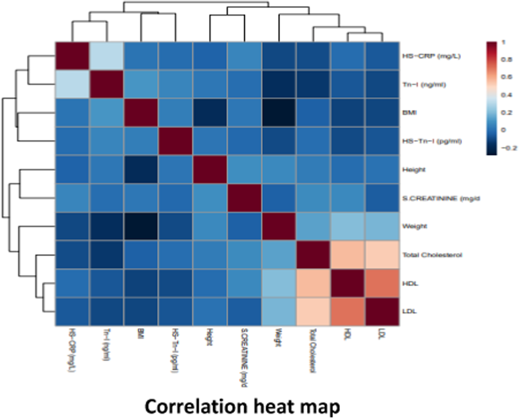 As observed in the results of one-way analysis of variance (Figure 2), BMI was found to be highest in the patients with severe stenosis, i.e., with more than 50% blockage. Total cholesterol was highest in both mild and severe category. While LDL cholesterol level was found to be elevated in all the three groups but was highest in the mild group. Troponin I was higher in the severe stenosis category. Figure 3 shows a correlation heat map within the variables used in this study among the three categories of patients. As seen in the map, the lower right corner represents a strong correlation between the variables in all the categories and it is found that total cholesterol, LDL and HDL cholesterol levels correlate strongly in a positive manner with each other. Cholesterol levels always pose a threat of vascular stenosis and hence could render a possibility of cardiovascular disorder arising due to hypercholesterolemia condition in these patients. Thus Figures 2, 3 make it very obvious that uncontrolled BMI, increasing weight and hyperlipidemia conditions are prominent reasons of vascular stenosis in cardiovascular disorder patients.