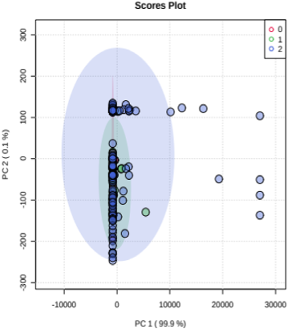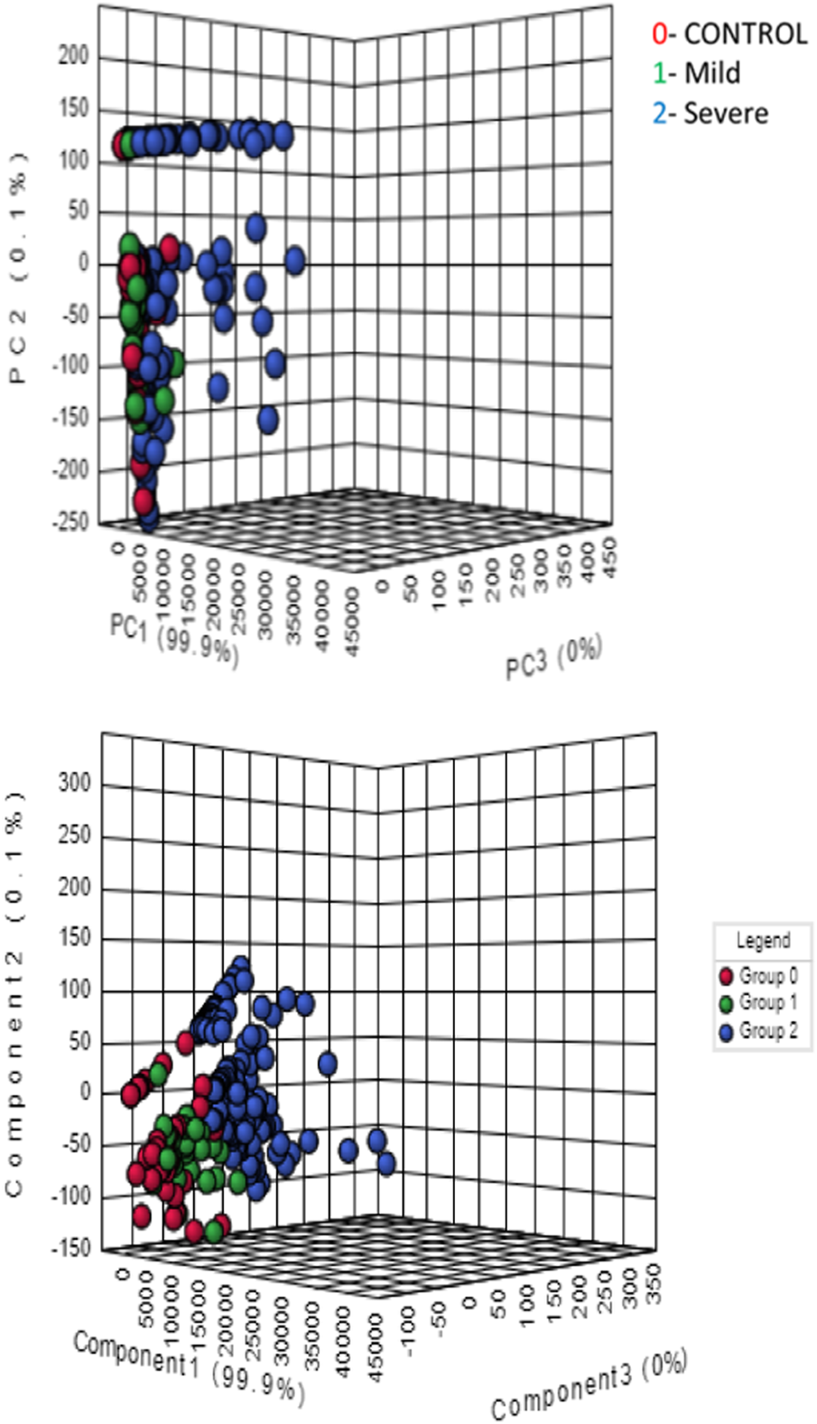 Principle component analysis (PCA) test was used to understand the clustering of healthy controls, mild stenosis and severe stenosis groups (Figure 4). Separation of the three groups was found to be less evident. We further performed Partial least square determinant analysis (PLS-DA) that showed good separation of the three groups and cross validation resulting in good model parameters (R2 = 0.86163, Q2 = 0.85006) (Figure 5).